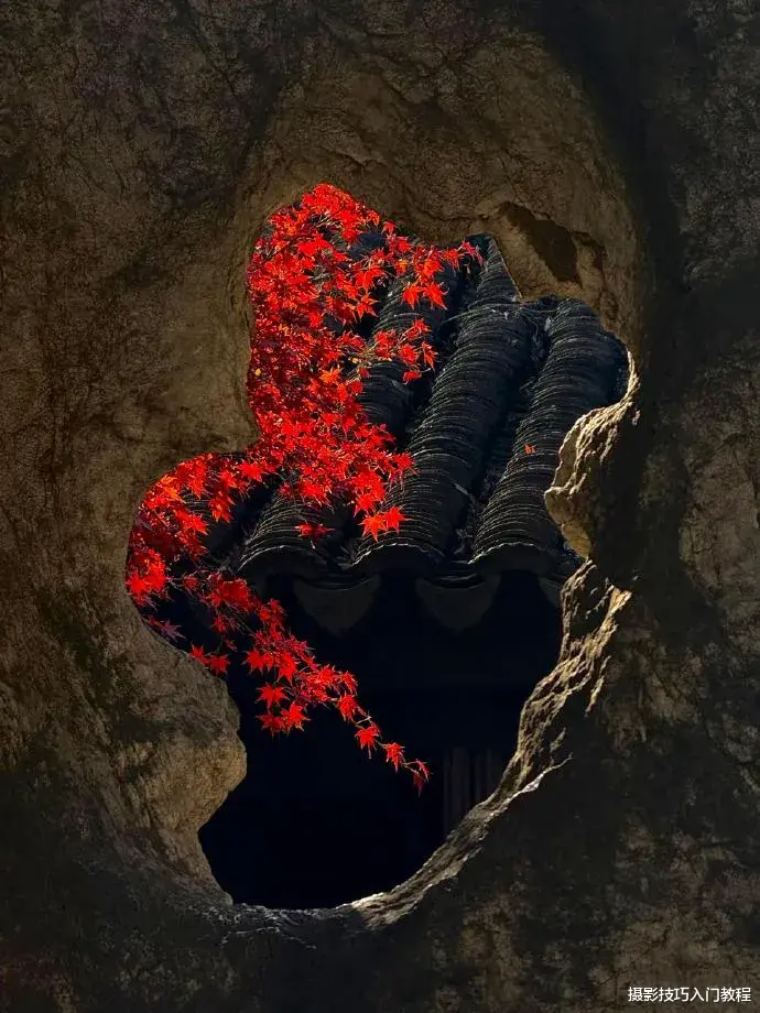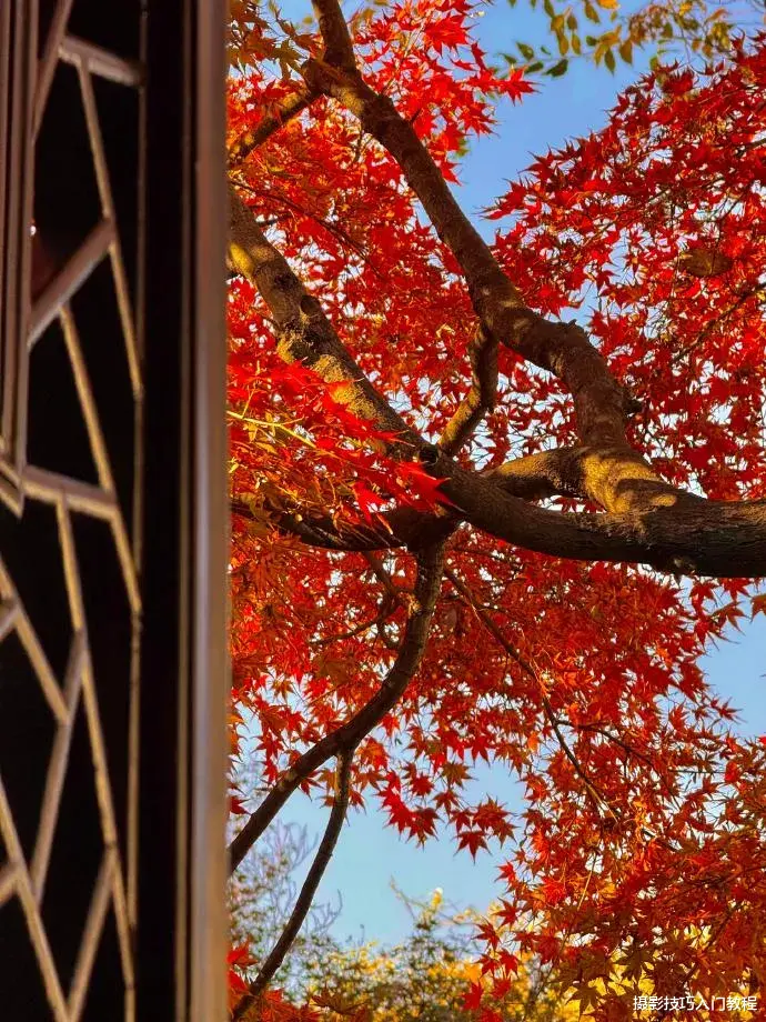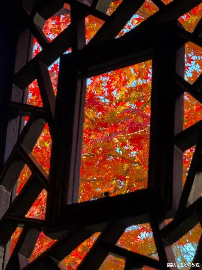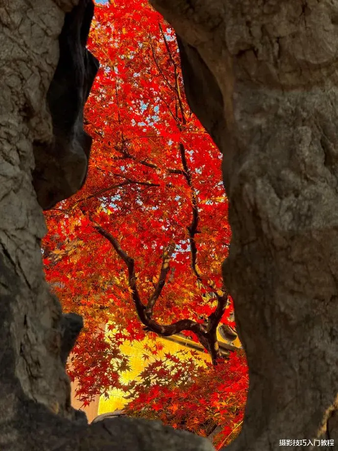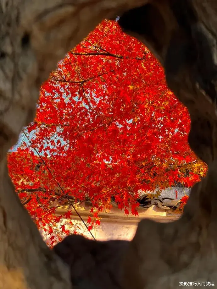利用周围环境的“框架”,将枫叶放进框架里,一下子就能抓住观众的眼球。比如说,利用石头与石头之间的缝隙,门窗等。暗色系的石头,门窗,配上亮色系的枫叶,照片一下子就有了亮点。
