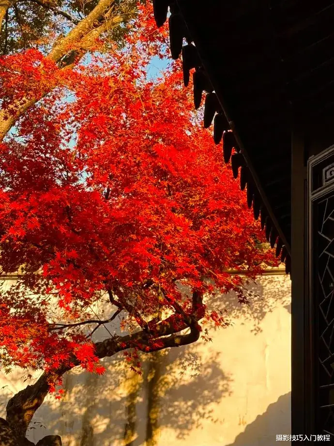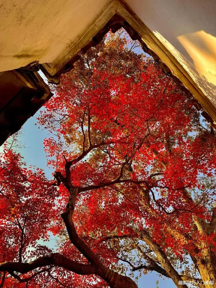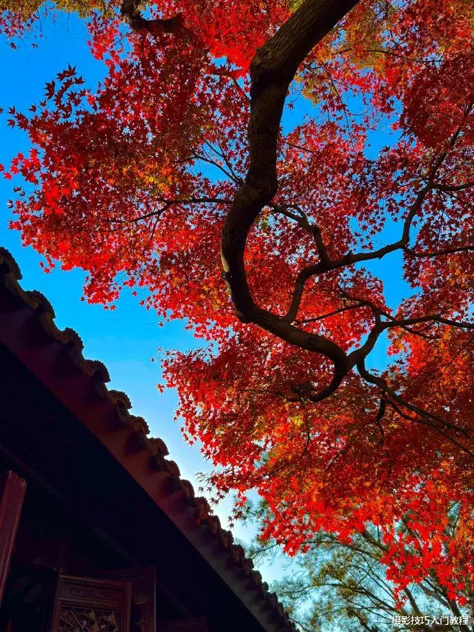 枫叶树很高大,人站在树下,抬头仰拍,火红的枫叶在阳光下异常好看,天空干净的背景也恰到好处,拍摄时可以将屋檐瓦片也拍进画面里,中国风让照片更加分。