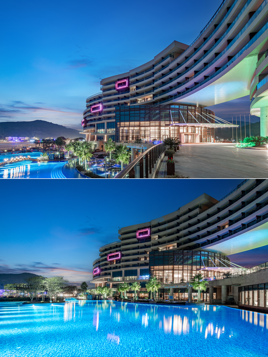 大堂空间挺高,大堂吧是看海景的不错选择,这里还设计了一个音乐水幕装置,夜里还挺炫酷的。酒店海心楼一楼就是户外泳池,连接着沙滩,度假感十足。