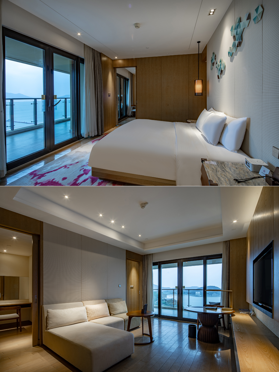 酒店的客房面积挺大的,宽大的落地窗很敞亮,而且阳台宽敞,坐在这里享受海景挺不错,清晨可以看日出,傍晚可以看晚霞,这里的光污染不高,还能看到星空。客房空间以海洋蓝和米白色为主色调,宁静而舒适的氛围。