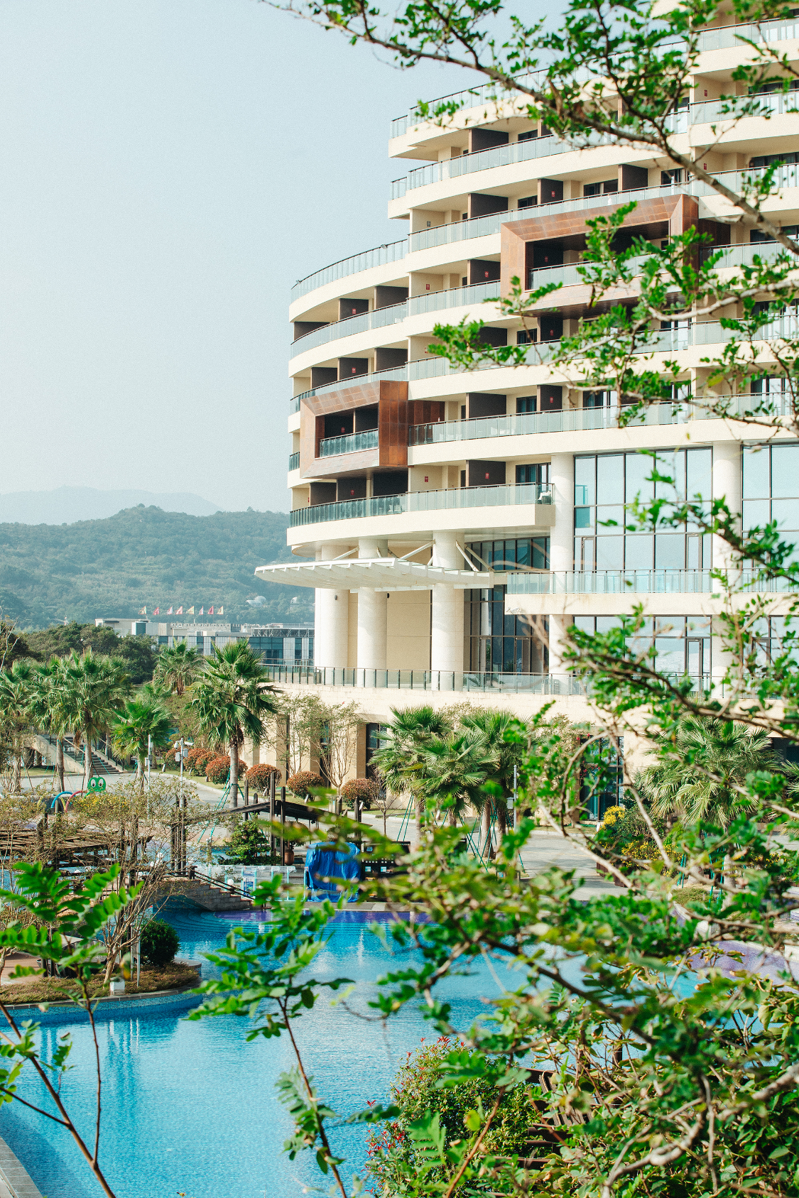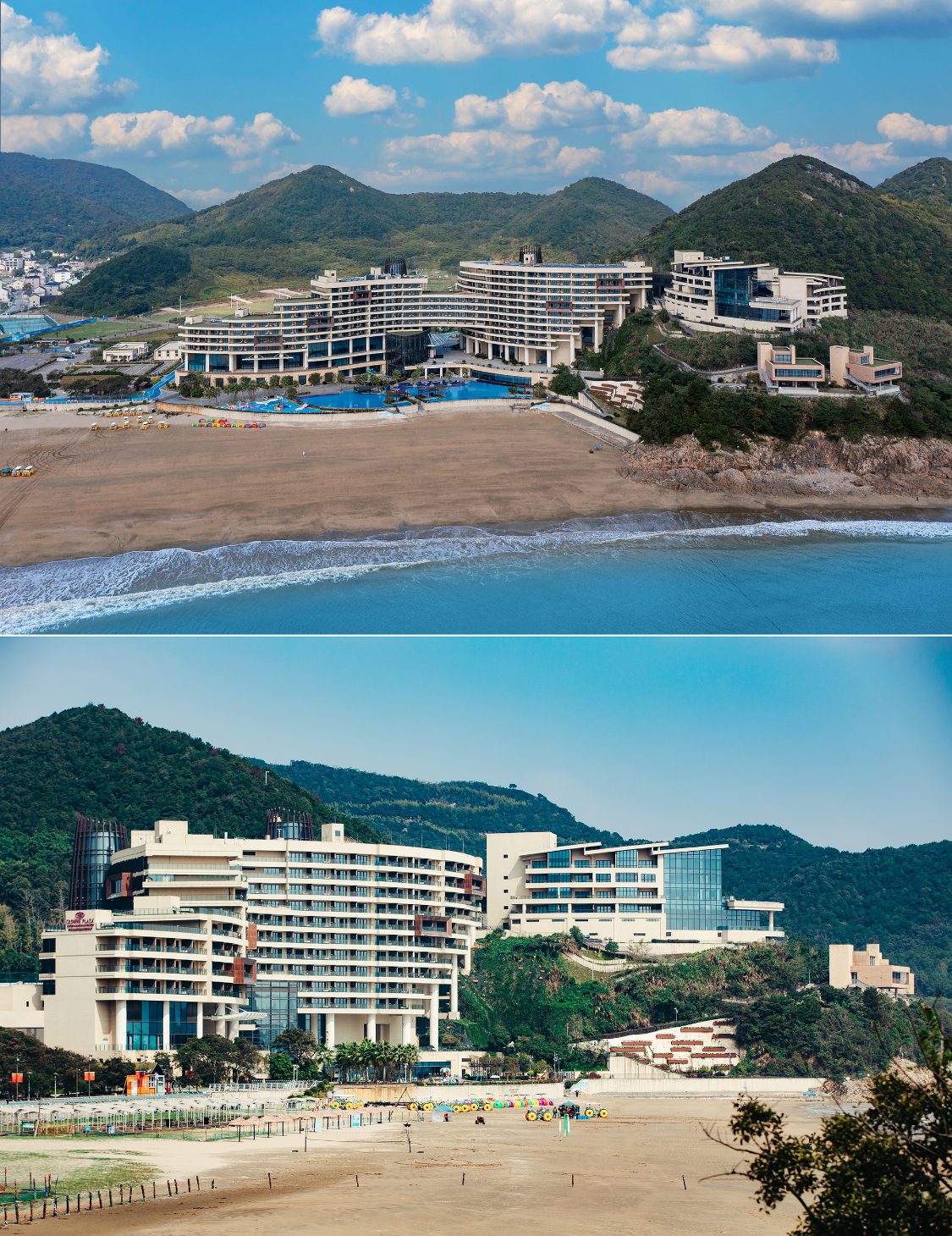 酒店沿海边山势而建,三栋建筑曲线仿佛浪花的律动高低错落,面朝大海,设计融合了海洋元素与现代风格,能看日出日落,看潮起潮落,有宽大的沙滩资源,这在东海边来说,很难得。