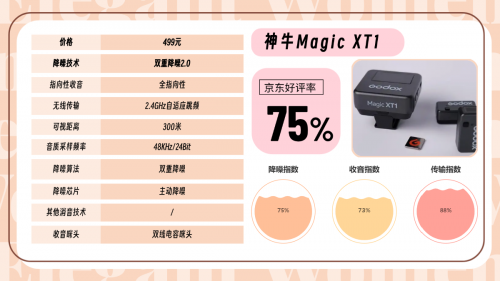 神牛Magic XT1聚焦“一体化专业创作”,采用2.4GHz数字跳频传输技术,抗干扰能力突出,实测无遮挡传输距离80米,在商圈、展会等复杂环境下仍能稳定收音。支持48kHz/24-bit无损传输,搭配低切滤波与ENC降噪,人声还原自然,是自媒体人、小型工作室的实用工具。