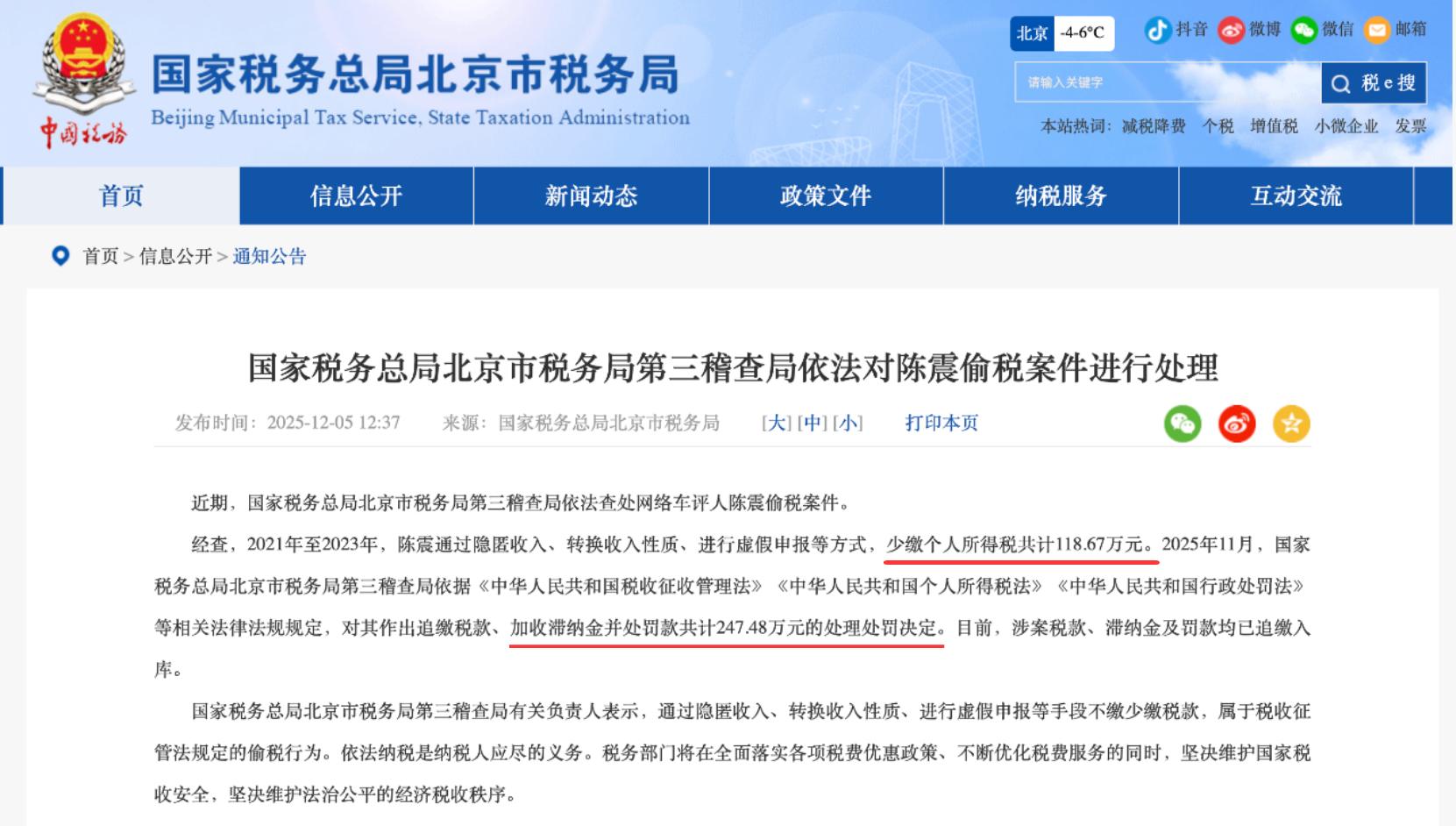 为什么被封呢?各平台没给出具体原因,但官方公布了一则消息,陈震因为偷税被查处。2021年至2023年,陈震通过各种手段少缴个人所得税共计118.67万元,被北京市税务局处罚,加上罚款,滞纳金,一共247.48万元。