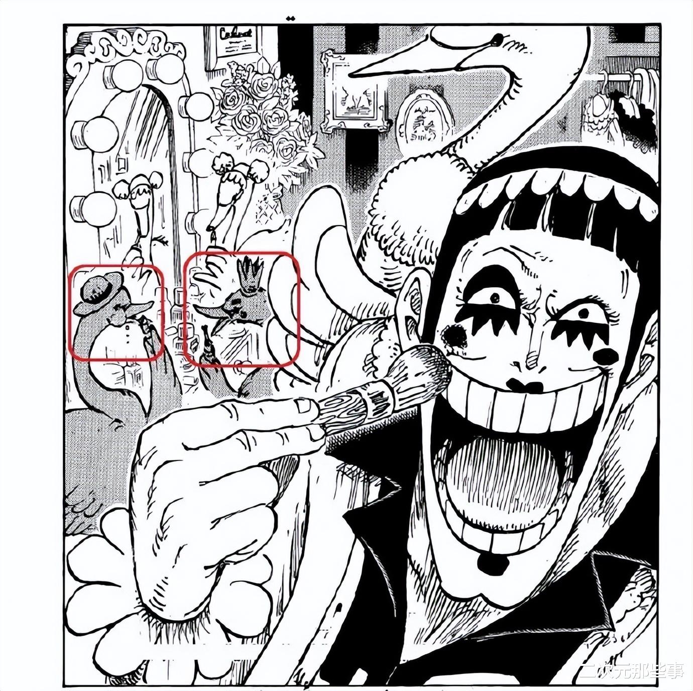 由于读者的要求只是化妆的天鹅,并没有要求天鹅要带帽子,所以这两只带着草帽和王冠的天鹅就是尾田自己的想法。而我们都知道草帽除了是路飞的标志以外还是乔伊波伊的标志,伊姆大人则是世界政府的王,王冠正好可以代表他。