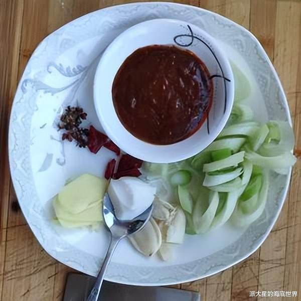 3、葱切大葱花,蒜拍散,姜切片,大酱一勺,猪油一小勺,花椒、干辣椒少许。