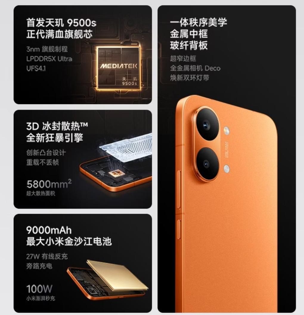 游戏党、性能党必选红米!天玑 9500S 3nm 全大核,跑分 361 万,原神、王者荣耀满帧跑无压力,144Hz 高刷屏 + 3840Hz 高频调光,滑动丝滑还护眼。100W 快充 40 分钟充满 9000mAh 电池,碎片化充电救急神器,金属中框 + IP69K 防尘防水,质感拉满,16GB 大内存后台保活 20+APP,多任务不杀进程,学生党、游戏党、爱折腾用户,选红米绝对不亏。