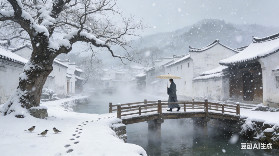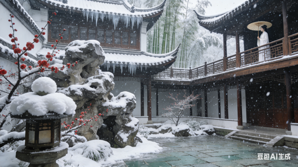 江南,从没见过这么大的雪,今年的天气格外严寒。大雪穿过帘子的空隙,像在寻找着什么东西。重重地压在树梢,仿佛支撑不住。