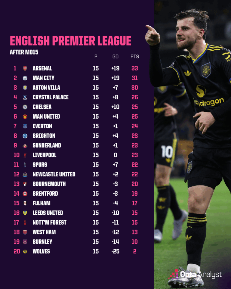 然而,下半场的全队爆发让他们在莫利纽斯4-1大胜,积分瞬间蹿升到第6,与切尔西同积25分,仅落后第四名1分。