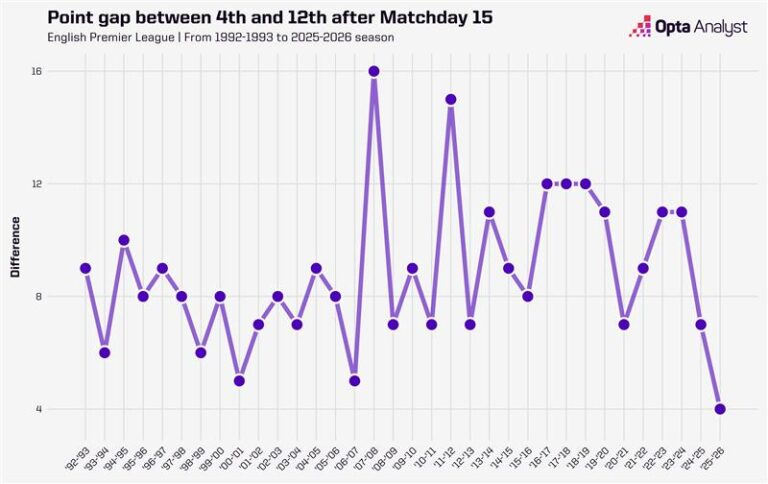 在2025-26赛季英超进行了15轮之后,第4名到第12名之间仅有4分差距——这可能正在酝酿英超历史上最紧张、最不可预测的欧战席位争夺。