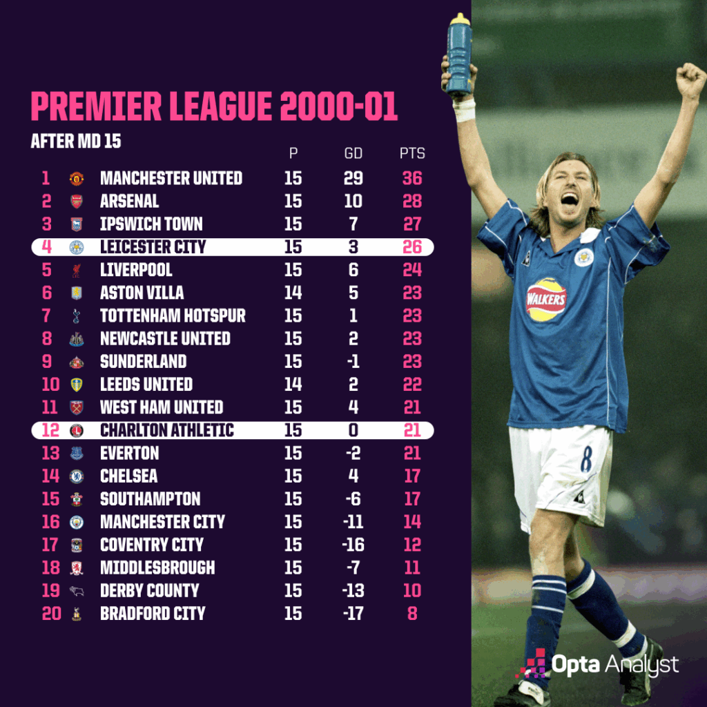 2000-01赛季:5分差当时第四是莱斯特城,第12是查尔顿,但莱斯特最终掉到第13。但那季曼联已领先第二名10分,冠军提前失去悬念。而本赛季的阿森纳仅领先2分。