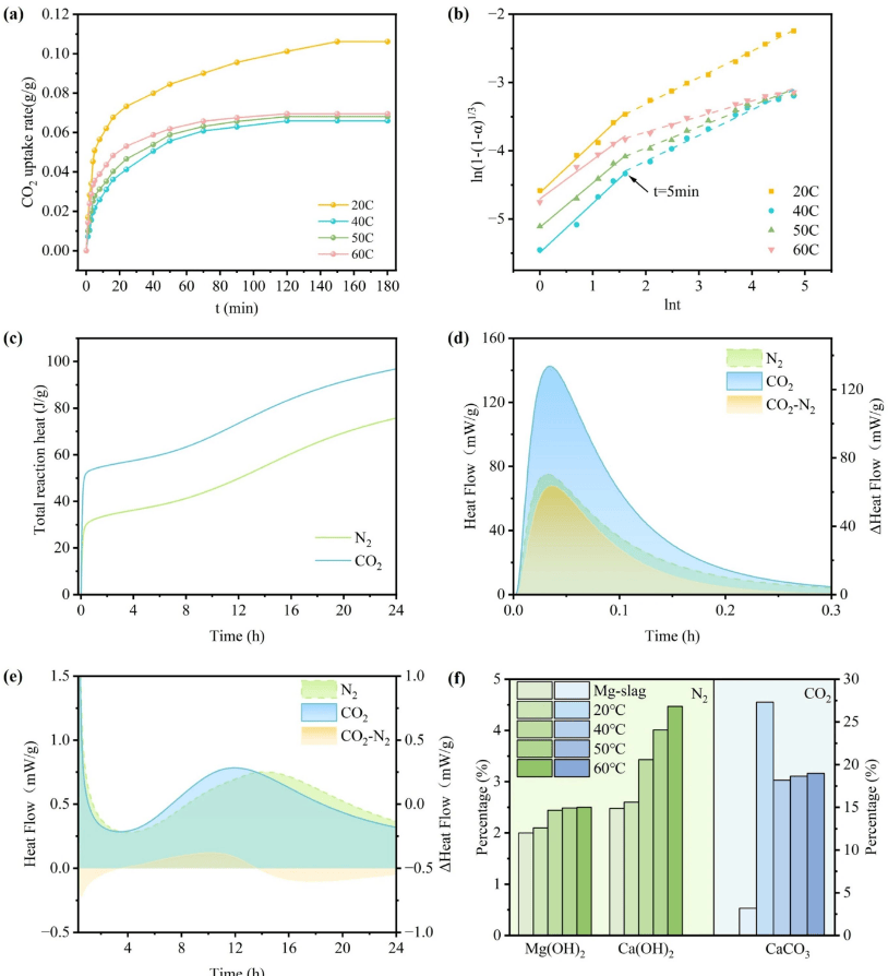 研究团队以皮江法镁冶炼还原渣为原料,探明直接碳化过程中温度超过40℃时水化反应占据主导并消耗水相环境,导致碳化效率恶化。水热活化预处理工艺通过生成高活性水化产物提供反应位点、优化孔隙结构缓解传质阻碍的双重机制,成功解耦水化与碳化的温度矛盾。实验确定60℃活化12小时为最优工况。