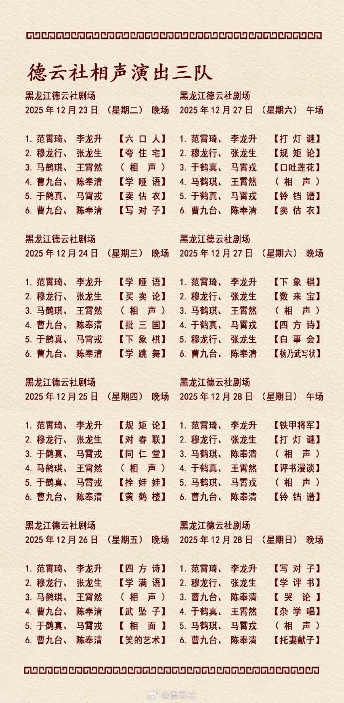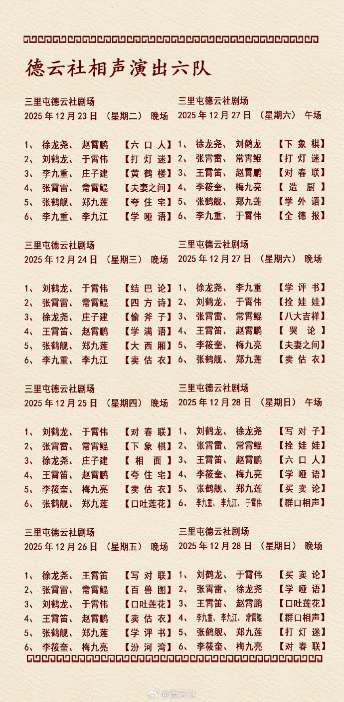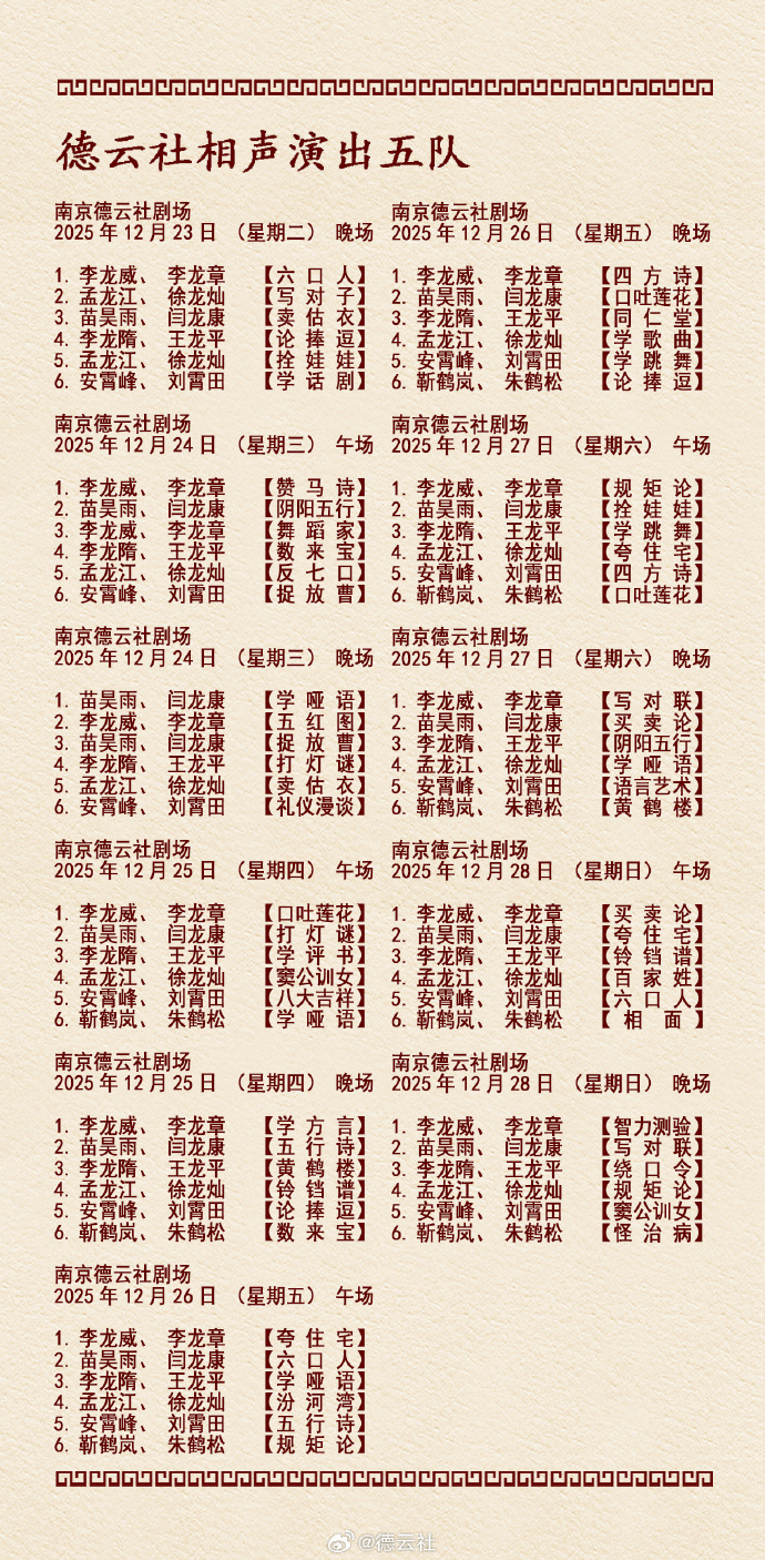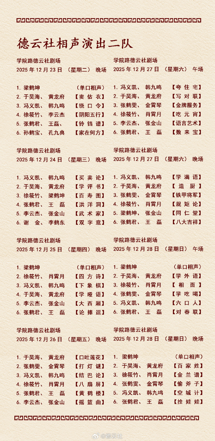 德云社相声演出节目单(2025年12月22日-12月28日 )