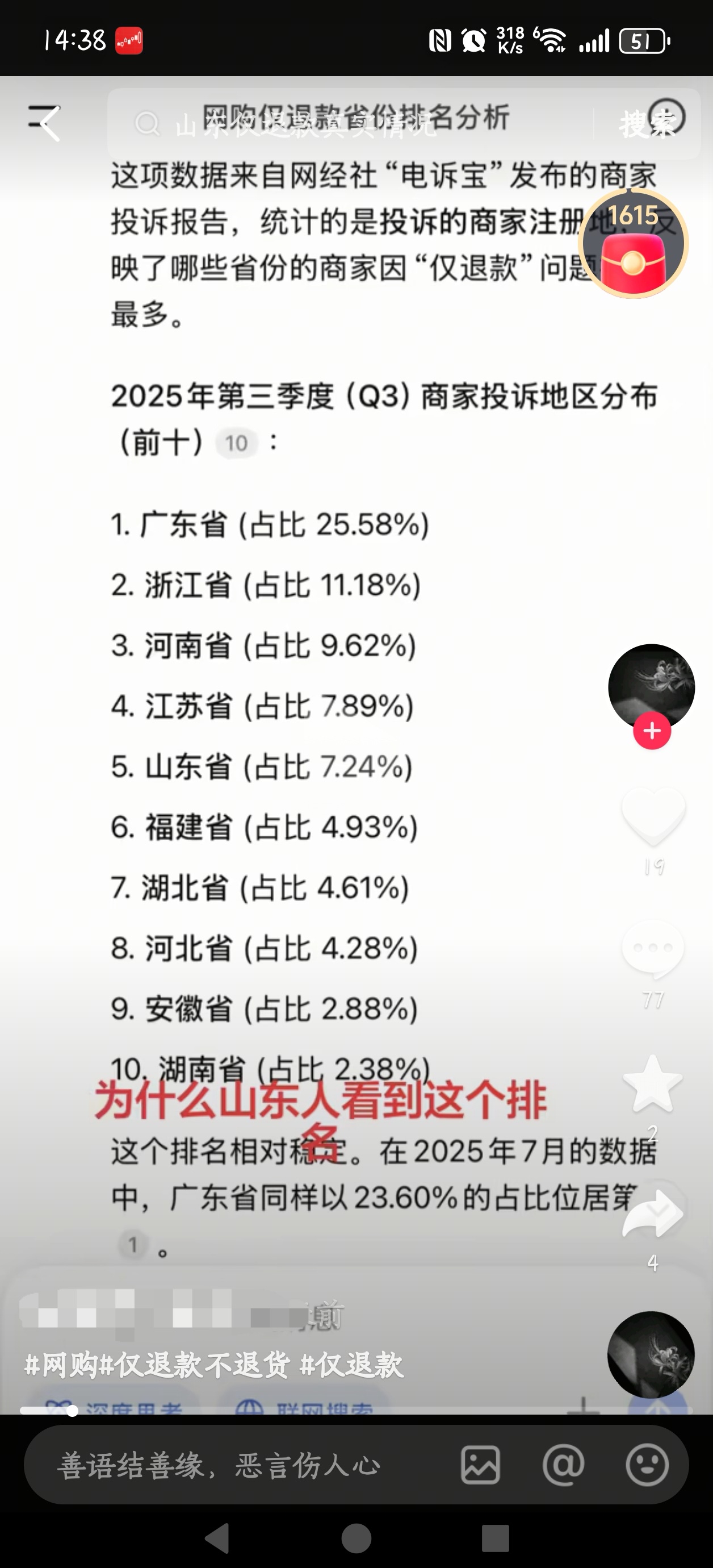 近日,一则山东网购“仅退款”多引爆网络,一些大品牌相继爆出不给山东发货。我查了一个起爆点。大致是13日在半月谈的抖音账号上出了一则消息。大意就是山东烟台的刘某半年内用6个账号“仅退款”225个包裹,涉案金额9万元,被依法处理。随即网络上出现大量关于山东“仅退款”的大量新闻,对山东进行抹黑。紧着着,山东网友开始了大反攻,相继曝光了一批不给山东发货的品牌,对不良商家有意思针对山东买家发“ab货”的问题进行了揭露,同时又从网络上查找了“仅退款”的全国排名,至此特仑苏、王小卤等品牌再也不敢提不给山东发货。事件到此告一段落。