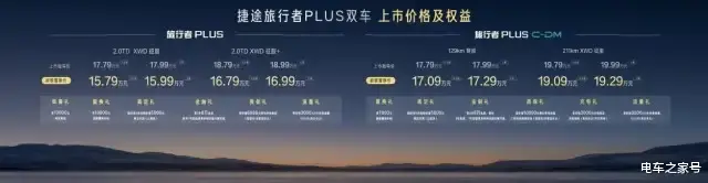 本次上市的捷途旅行者PLUS系列,覆盖“燃油+电混”双动力布局。捷途旅行者PLUS提供2.0TD XWD征服、2.0TD XWD征服+两款配置,官方指导价为17.79万元-18.99万元,超级置换价15.79万元-16.99万元。捷途旅行者PLUS C-DM则推出129km穿越、211km XWD征服两款配置,官方指导价为17.79万元-19.99万元,超级置换价17.09万元-19.29万元。值得一提的是,捷途汽车为用户准备了覆盖全周期的专属权益。捷途旅行者PLUS用户可享10000元购车基金、10000元超级置换补贴、限时6折选购价值5000元高定车漆(公路灰)、3年8万免息(更有7年超低息等多种金融方案可选)、价值6888元整车终身质保(限首任/非营运车主),以及价值3000元的5年免费流量(10G/月,限首任车主)。捷途旅行者PLUS C-DM用户可享与旅行者PLUS相同的高定礼、流量礼,以及7000元超级置换补贴,多种金融方案可选(3年8万免息、5年免息、7年超低息等),价值10000元整车终身质保、三电终身质保权益(限首任/非营运车主),价值3000元充电桩及安装服务(首任车主1年内有效),让用户购车、用车全程无忧。