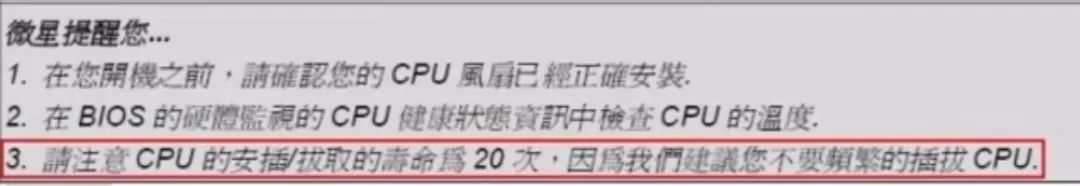 我在网上搜了一下,看到了微星主板的说明书,里面的一句话让我有些为难了。说明书上写着CPU插槽使用寿命只有20次,莫非,寿命已经到了?