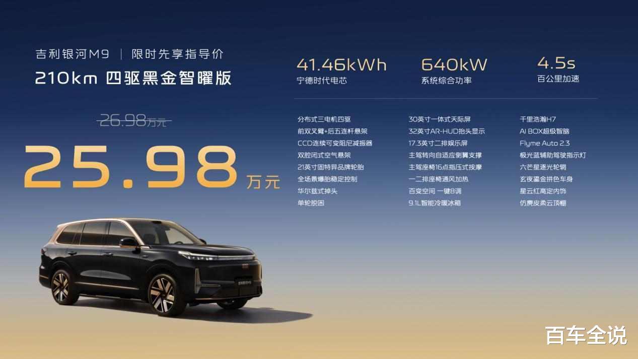 吉利银河M9黑金智曜版限时先享价为25.98万元,为回馈用户长久支持和信赖,吉利银河同步推出重磅上市权益政策:即日起至5月31日,购车可享5000元超级购置税补贴以及5000元限时保险;更可获赠27扬Flyme Sound 无界之声音响、终身免费 NOA 辅助驾驶服务、至高10000元置换补贴等至高价值78000元专属权益。