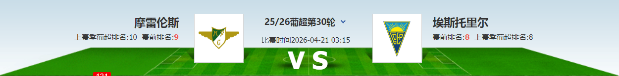 埃斯托里尔在2020-21赛季,拿下了额葡甲的冠军来到了葡超,球队在葡超已经混迹了4年,可以说是老油条了,其中多次险些降级最终都化险为夷。球队最近的表现同样不佳,上轮球队不敌波尔图拿到了三连败,球队目前急需一场胜利重返胜轨。客场方面球队的表现还说得过去。