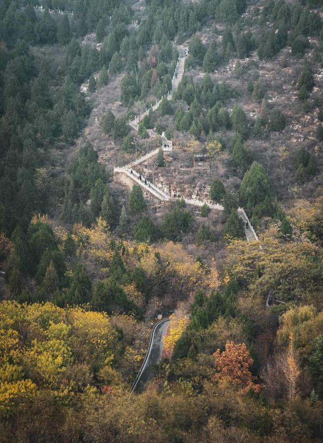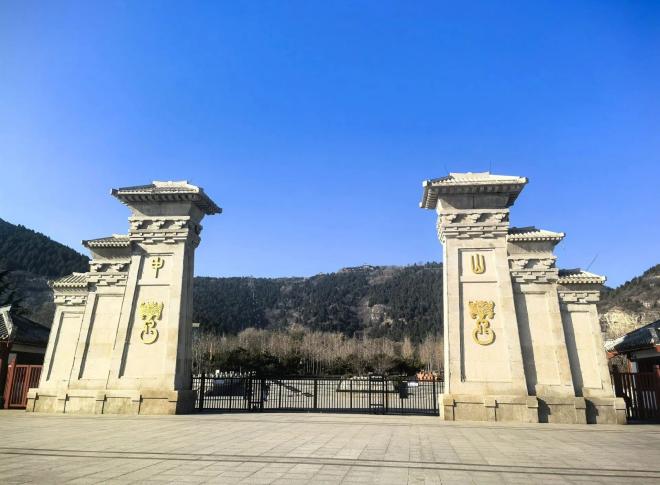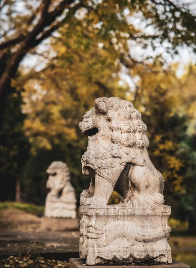沿着石阶向上走,两侧的石狮子蹲踞百年,鬃毛的纹路里藏着岁月的风沙。山间的树木在冬日里呈现出深浅不一的黄绿交织,踩着落叶沙沙作响,仿佛与两千年前的汉家匠人擦肩而过。