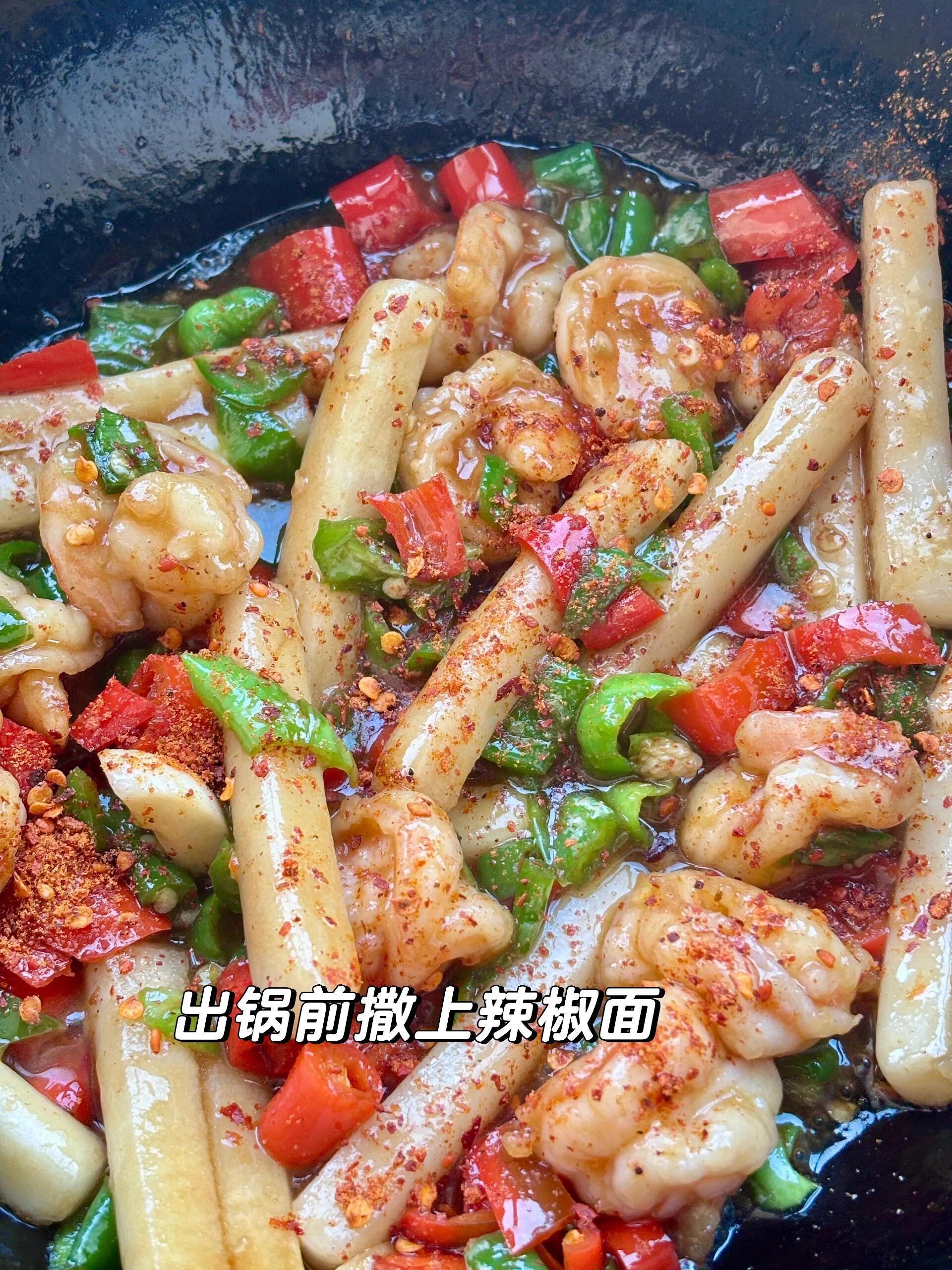 这道菜的精髓在于快手和调味。虾仁易熟,不宜在锅中停留过久,否则容易变老失去弹性,所以整个过程要干净利落。年糕本身没有太强烈的味道,全靠料汁和配菜赋予它灵魂,因此料汁的平衡就显得尤为重要,不宜过咸,也不能太淡,才能衬托出食材的本味。最后的辣椒面是点睛之笔,它不仅是颜色的点缀,更增添了一丝烧烤般的焦香,让整道菜的风味更加立体。