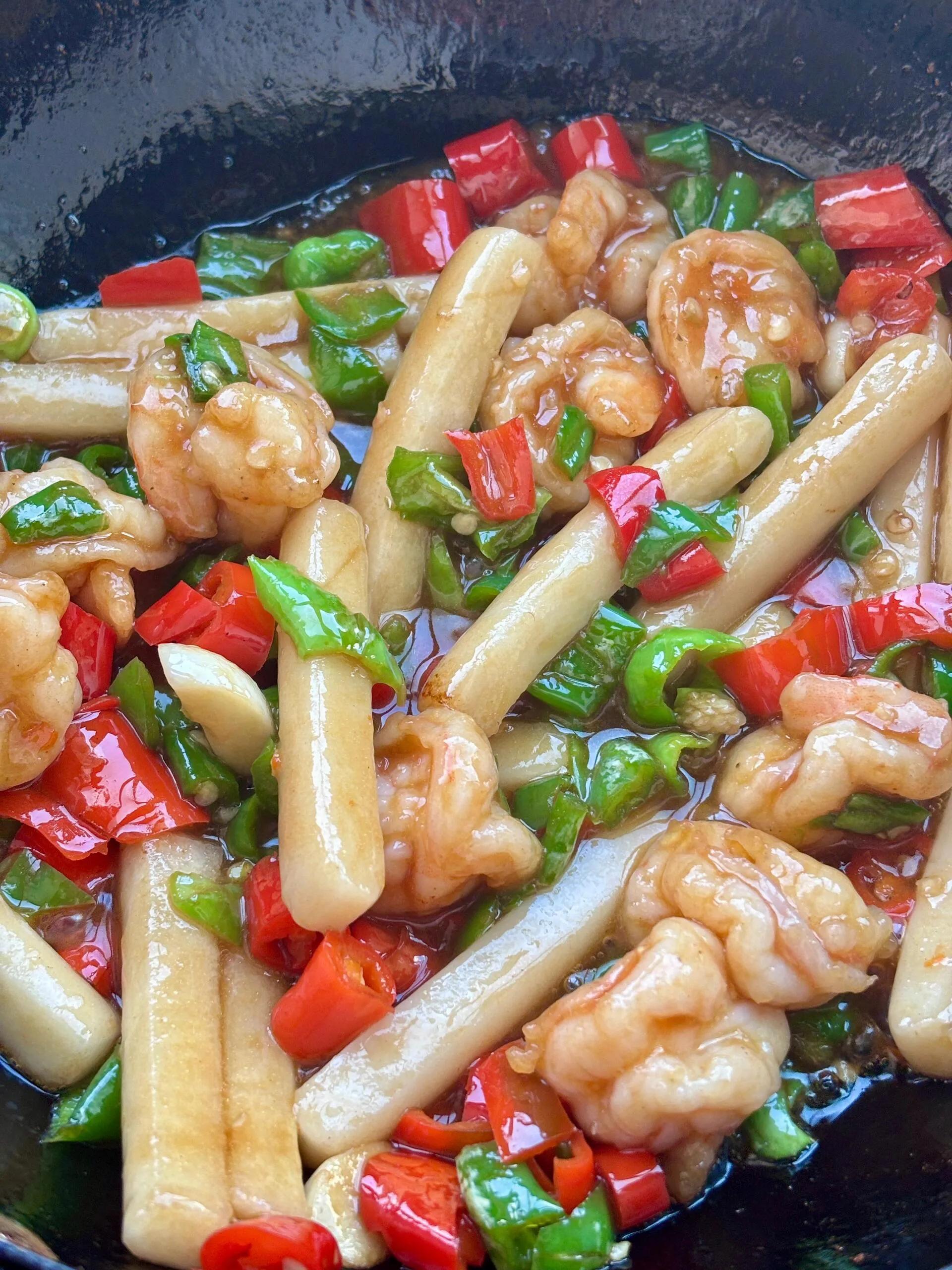 这道菜的主角是虾和年糕,搭配辣椒和大蒜的经典组合,再撒上画龙点睛的辣椒面。虾的鲜甜与年糕的软糯相互交融,在酱汁的包裹下呈现出迷人的光泽,光是看着就让人食指大动。而这道菜背后的故事,其实源于一次偶然的厨房创意。那天冰箱里只剩下一些虾和过年没吃完的年糕,本想随便炒炒凑合一餐,却不料调出的料汁与食材碰撞出了意想不到的火花,从此它就成了我家餐桌上的常客。