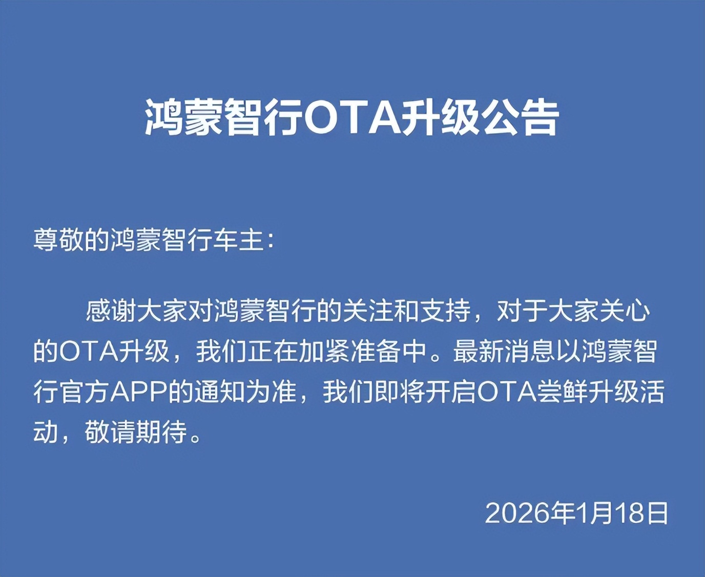 12号这张截图出现,18号鸿蒙智行官方就发布公告,称大家关心的 OTA 升级正在加紧准备中,即将开启尝鲜升级活动。