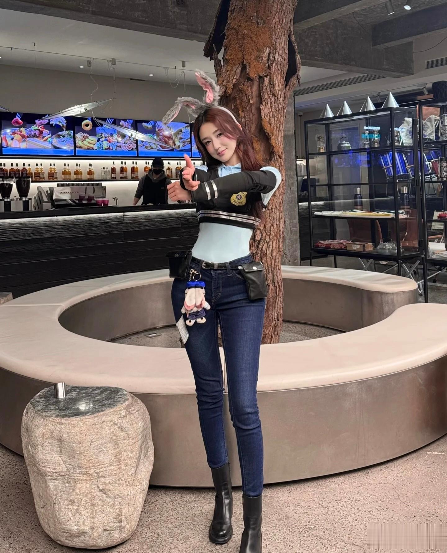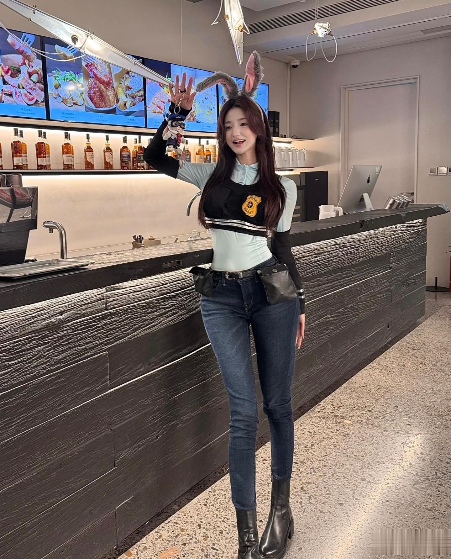 饮品店前台拍摄,紧身牛仔裤勾勒出完美的腰臀比曲线,她留给你的只是背影兔兔头饰比耶,腰部线条超好双手叉腰尽显完美好身材校花