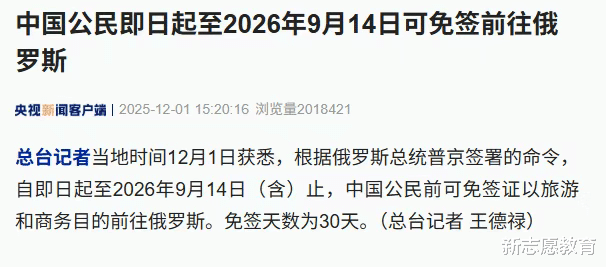 12月1日获悉,根据俄罗斯总统普京签署的命令,自即日起至2026年9月14日(含)止,中国公民可免签证以旅游和商务目的前往俄罗斯。免签天数为30天。