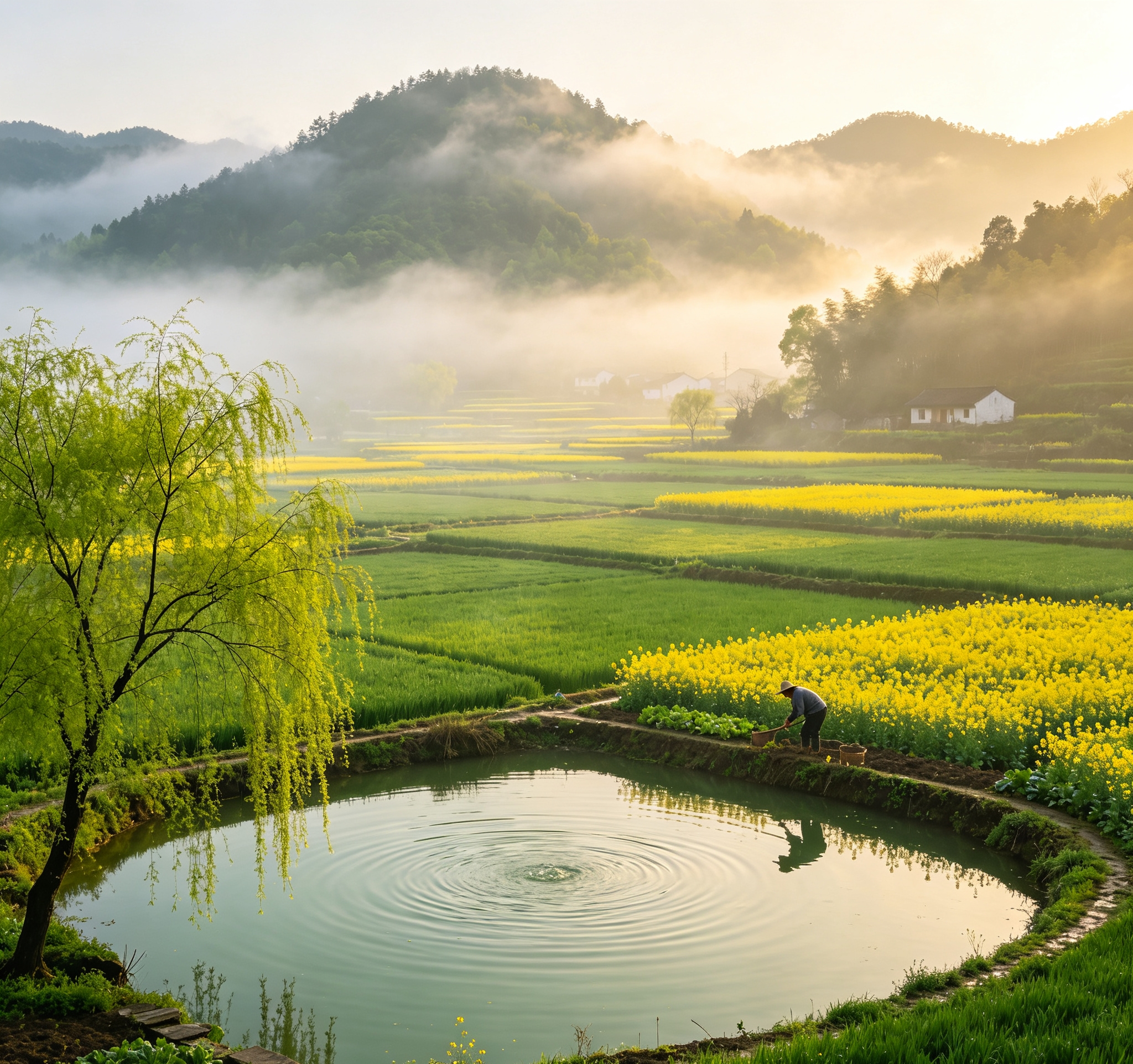 【释义】杏花时节细雨沾衣不湿,春风拂过杨柳,温暖柔和,惬意无比。