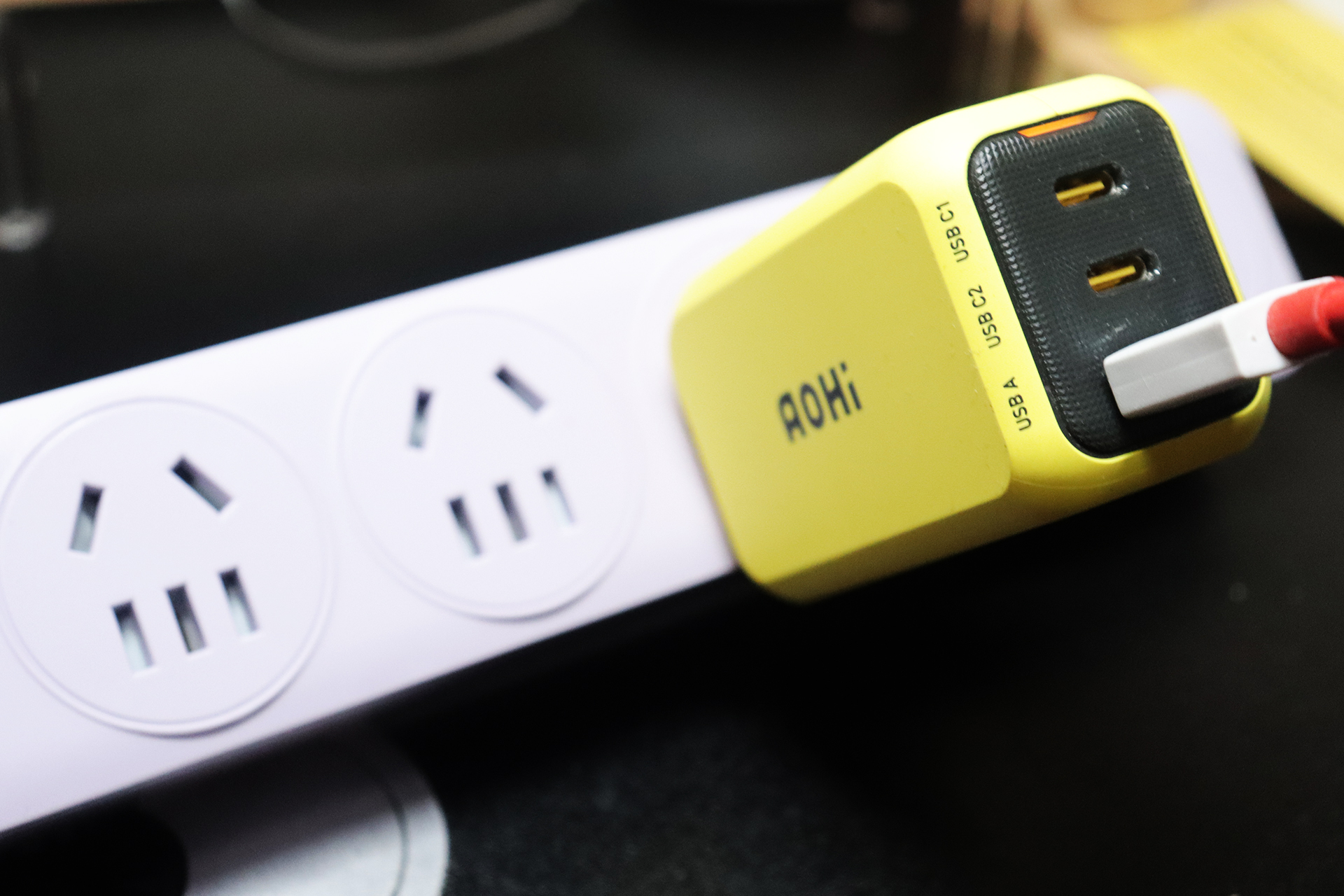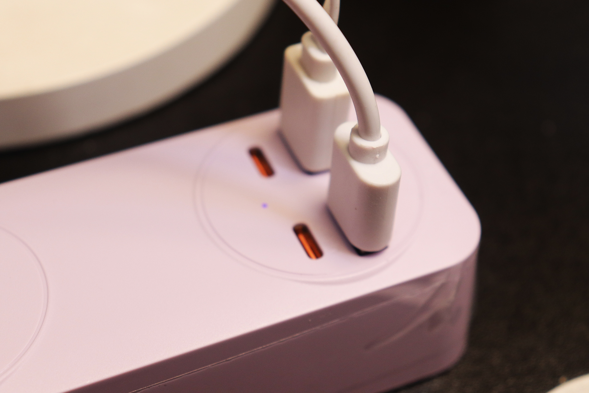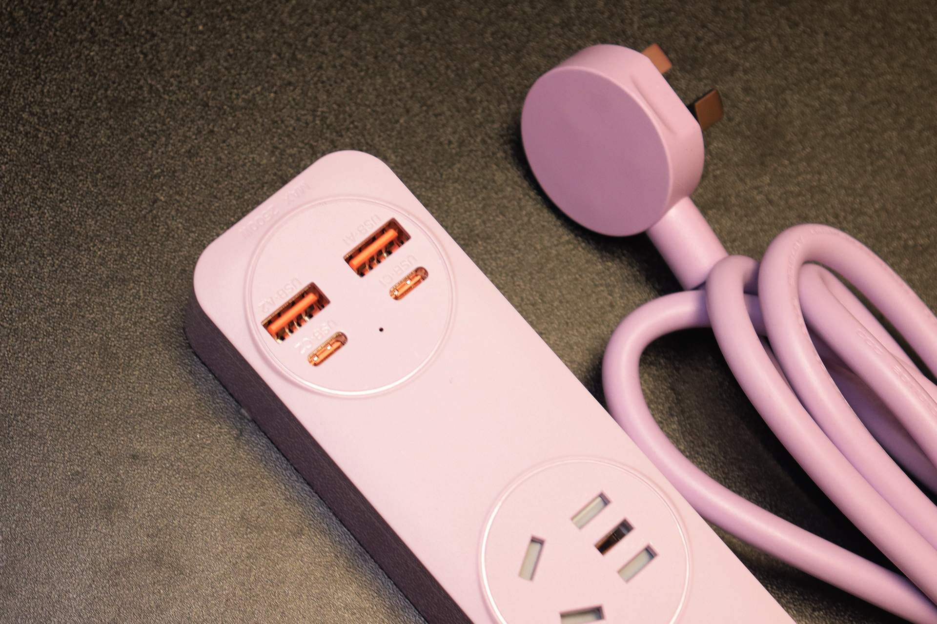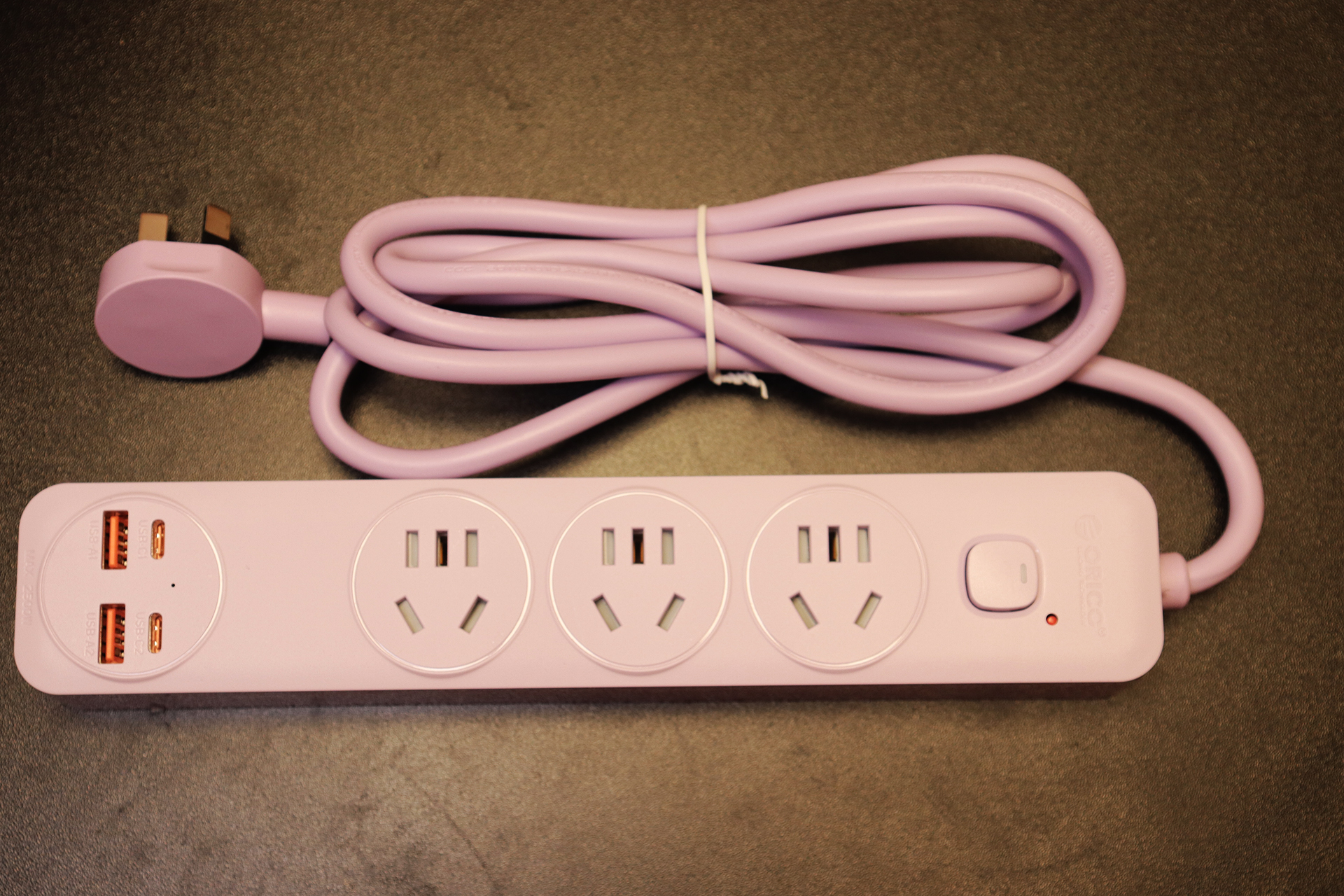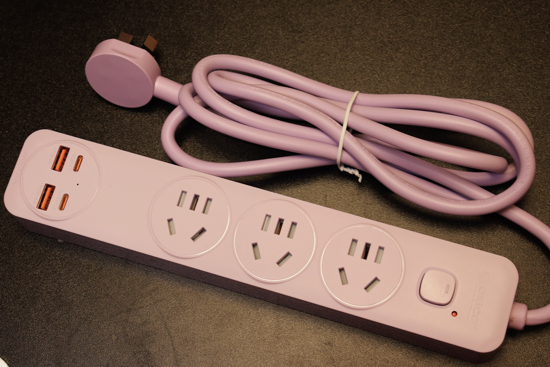 更戳我的是它的简约百搭配色,我入手的紫色款和我的原木风桌面完美融合,就算直接放在桌面也不突兀;如果是科技风桌面,搭配同系列深色款,还能提升整体质感。底部的防滑硅胶垫是个细节加分项,放在桌面使用时稳稳当当,不会因为拉扯线材而移位,进一步避免了线材缠绕的问题。对追求桌面统一性的用户来说,这种“不突兀、能融入”的设计,比单纯的功能性插排更有吸引力。