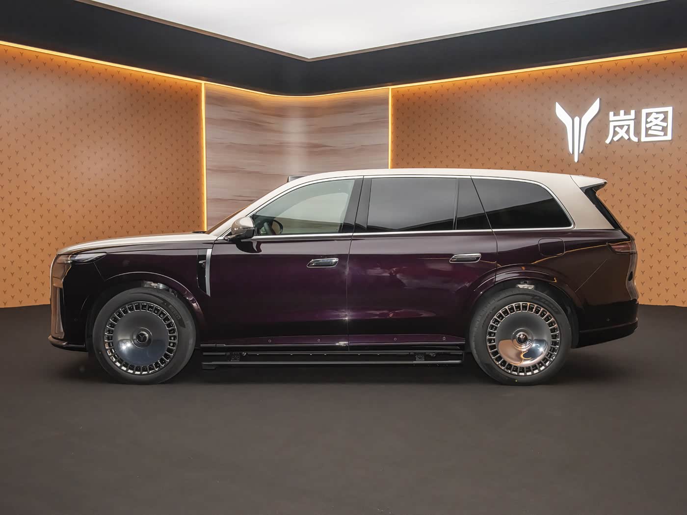 来到侧面和尾部可以看到,岚图泰山的车身造型极为浑厚,简约的线条突出了“大道至简”的设计理念,双拼色车身以及22英寸的大饼轮圈,都彰显出了这台车与众不同的尊贵。尺寸方面,这台车完全可以用庞然大物来形容,它的长宽高分别是5230/2025/1817mm,轴距为3120mm。