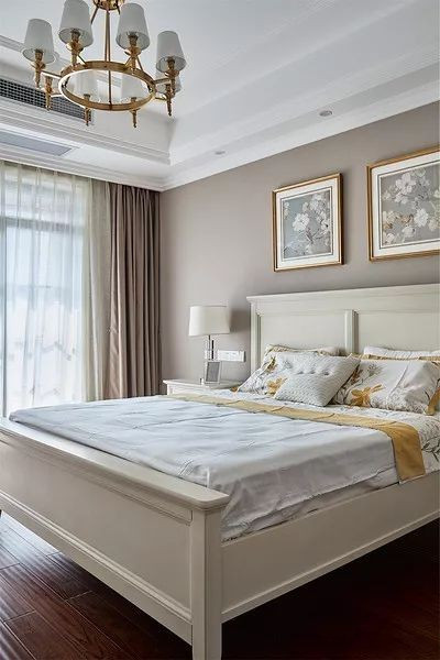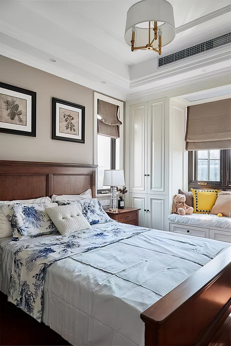 主卧,采光也很好,带有个飘窗,窗户框架设计都是按照美式风的设计来做的,深木纹的大床,在整个美式风的空间内更有复古古典的味道。