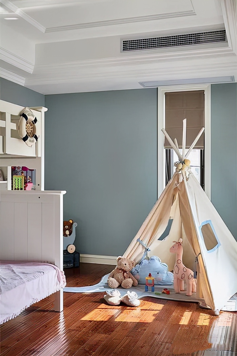 儿童房,空间比较大,除了摆放床和学习桌之外,还有个玩耍区,这样的环境给到孩子成长,是不是非常的舒适呢?