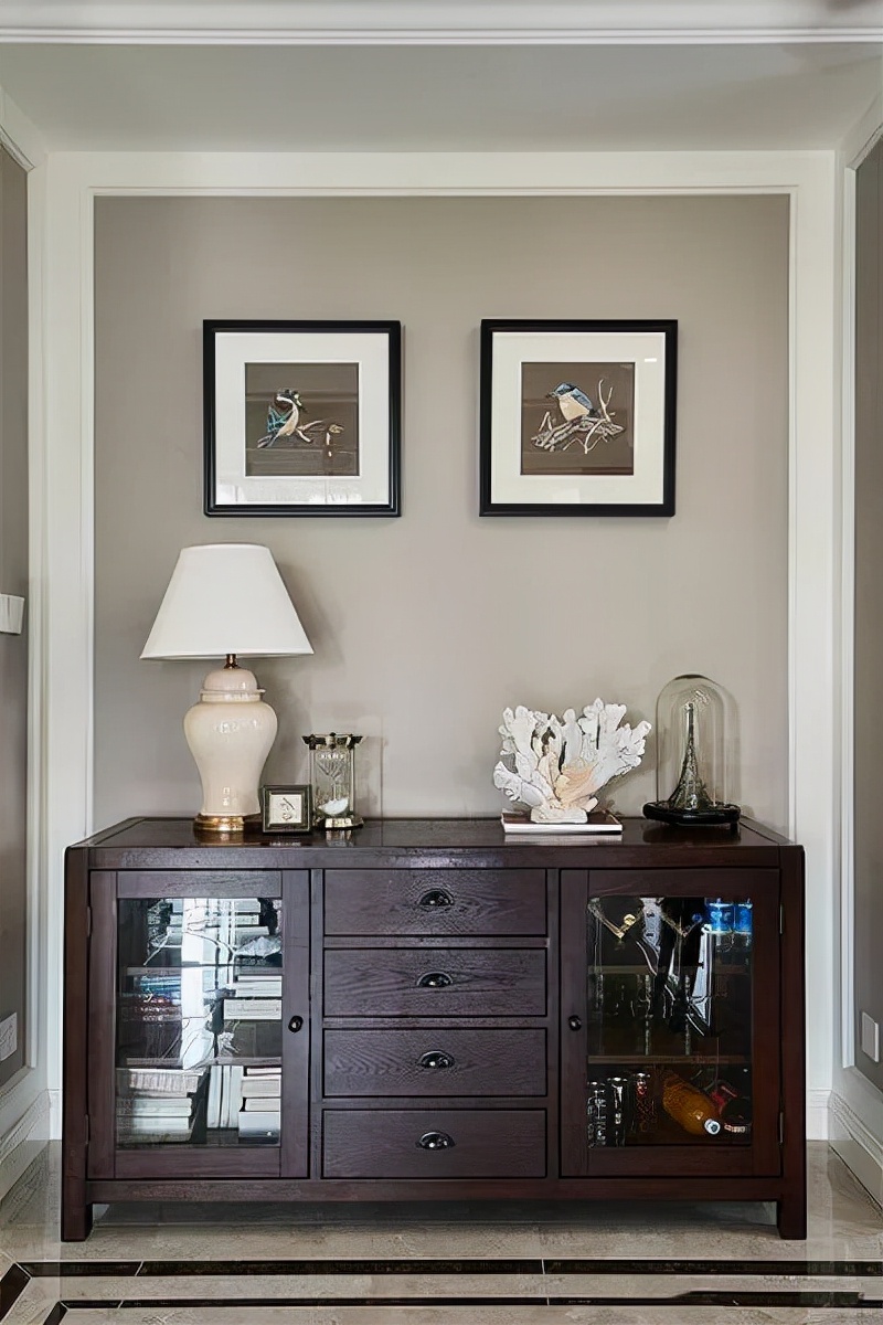 很多人都以为这边是餐边柜,实际上我们把它当做玄关柜,用来收纳一些书籍和摆放一些艺术品,作为门面也比较好看,你们觉得呢?
