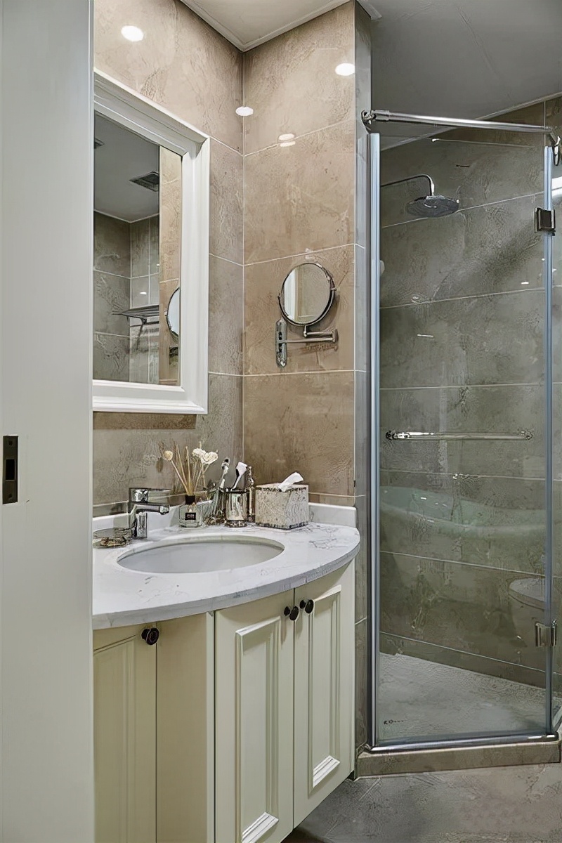 主卫做的是浴缸,没有做干湿分区,不过两个卫生间的设计都是差不多的,色调一致,实用为主。