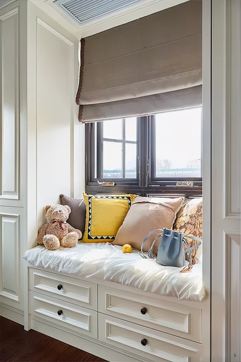 飘窗左右两边是定制的柜子,增大了室内的收纳,而且白色的实木柜子更显得高贵和大气。