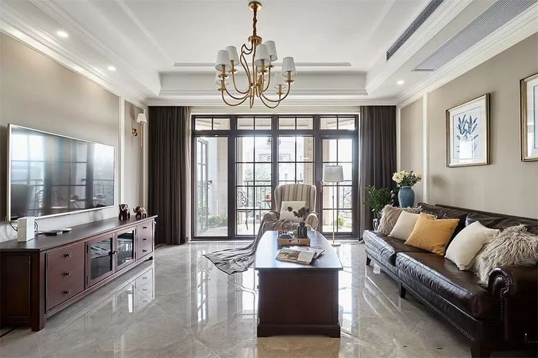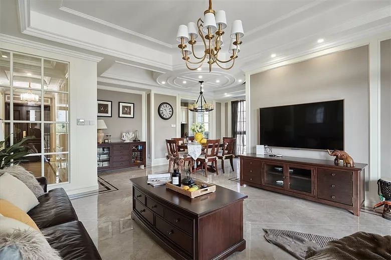 客厅天花板做了吊顶,因为户层高,所以做得吊灯的设计,不仅大气,而且整个空间非常的宽敞,所以一点都不会觉得压抑。