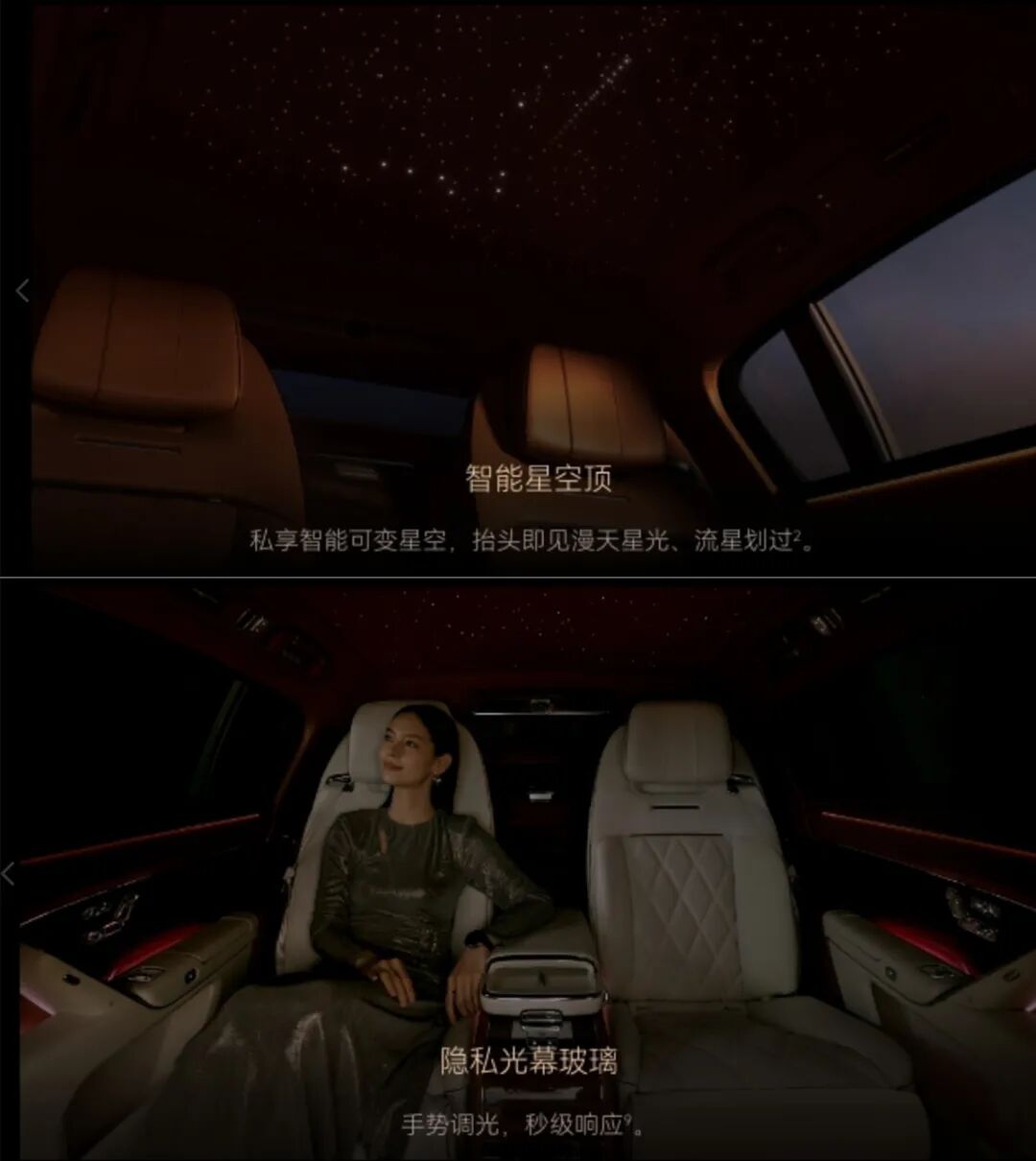 再往上看,头顶是智能可变星空顶,满天星光缓缓流淌,偶尔还有流星划过,北斗七星的轨迹也能随手调出来,劳斯莱斯的星空顶瞬间就不璀璨了。