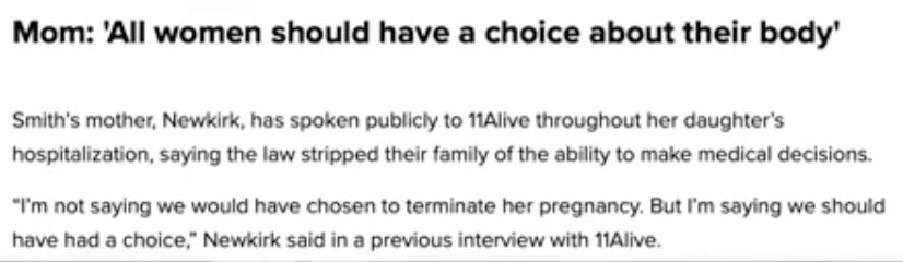 当时那节骨眼上,他们虽然没有公开表示有没有打算让孩子出生,但是史密斯的妈妈觉得,女儿作为一个人,应该有支配自己身体的权利,那女儿脑死亡去世,应该由家人决定这个孩子要不要留下。