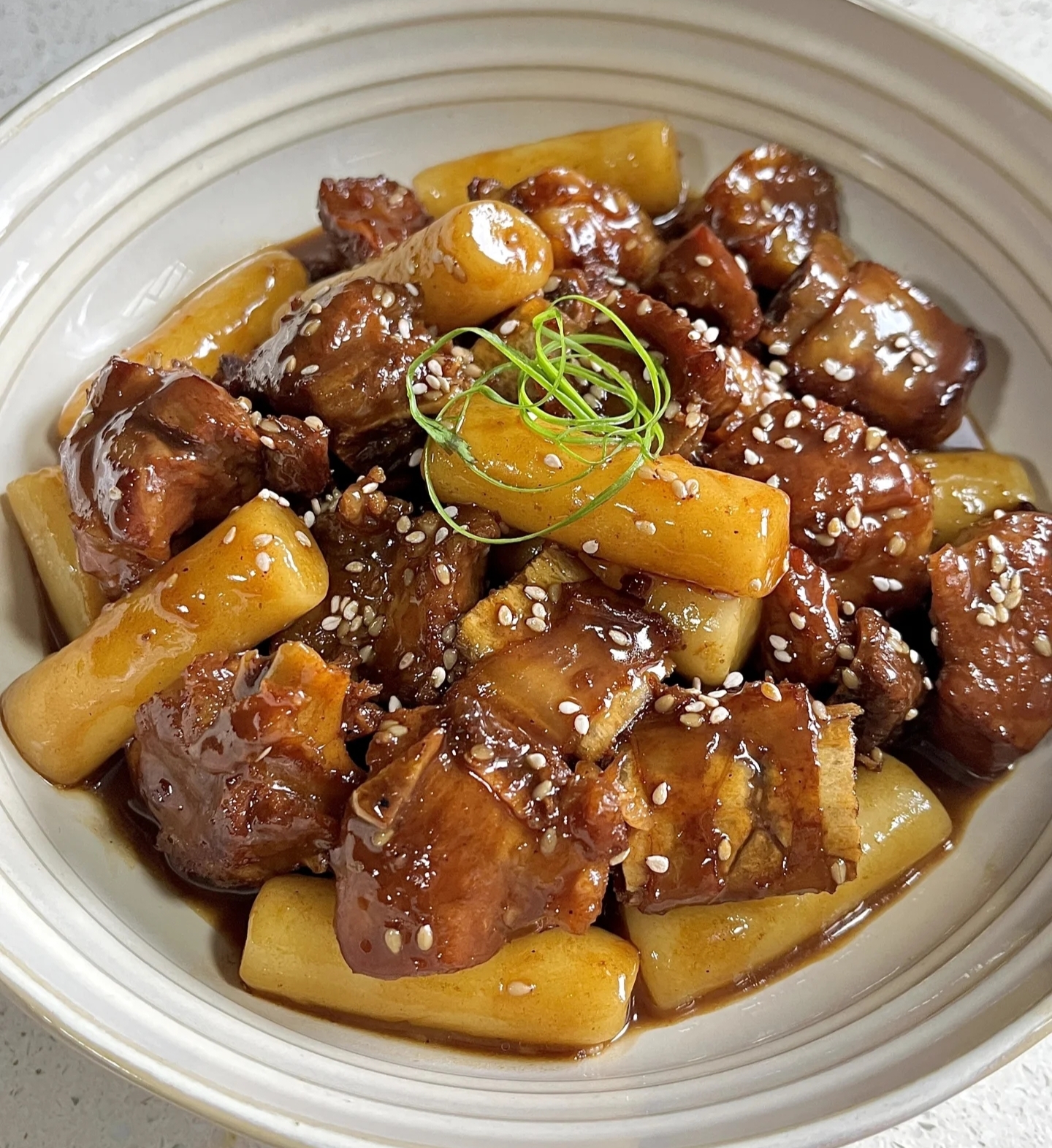 撒一把白芝麻和葱花,金黄酥香的排骨配糯叽叽的年糕,红亮亮的酱汁裹满每一口,这颜值,直接端上桌当硬菜,朋友来了都夸你是“隐藏大厨”!