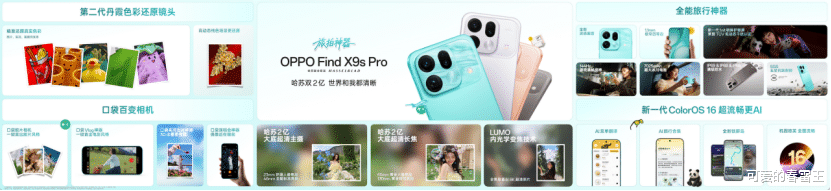 2026年4月21日,成都——OPPO 正式发布旅拍神器 Find X9s Pro和专业口袋哈苏 Find X9 Ultra两款旗舰新品。Find X9s Pro 带来 Pro 档唯一哈苏2亿大底超清主摄和能力更强的哈苏2亿大底超清长焦,第二代丹霞色彩还原镜头等全面升级的影像配置,解锁旅拍新境界。在视频方面,Find X9s Pro 支持电影级专业视频录制,持续助力旅拍体验。全新Find X9 Ultra搭载全新哈苏 10 倍光变天眼长焦、哈苏双2亿超大底超清主摄和超清长焦,将移动手机影像的能力上限推向全新高度。新一代ColorOS 16带来全面进化的AI一键闪记能力,一键打造AI旅行合集、知识合集,真正让AI赋能日常生活,全新锁屏岛功能全面登陆 Find X9s Pro和 Find X9 Ultra,胶囊态、沉浸态双形态设计兼具美观和实用。