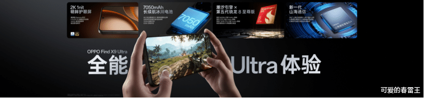Find X9 Ultra 搭载行业领先的 2K 1nit明眸护眼屏,并带来人因亮度舒适调节功能,满足不同敏感度人群对亮度舒适度的精细化需求。OPPO 潮汐引擎和第五代骁龙 8 至尊版的性能组合,确保Find X9 Ultra在长时间、高强度的拍摄录制下也毫无压力。7050 mAh 长续航冰川电池,搭配 100W 超级闪充与 50W 无线闪充,提供全面领先的续航体验。