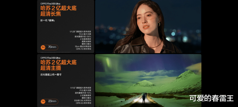 Find X9 Ultra 还搭载了哈苏双 2 亿超大底主摄/长焦的镜头组合。 70mm 哈苏超大底超清长焦首发搭载全新 1/1.28英寸超大底 2 亿像素传感器,配合 F2.2 超大光圈,综合进光量达到前代的136%,是今年目前为止所有厂商中进光量最大的长焦机型。23mm 哈苏超大底超清主摄搭载 1/1.12英寸超大底 2 亿像素传感器,配合 F1.5 超大光圈,综合进光量是前代一英寸主摄的110%,以超越一英寸的画质表现,引领主摄新极限。
