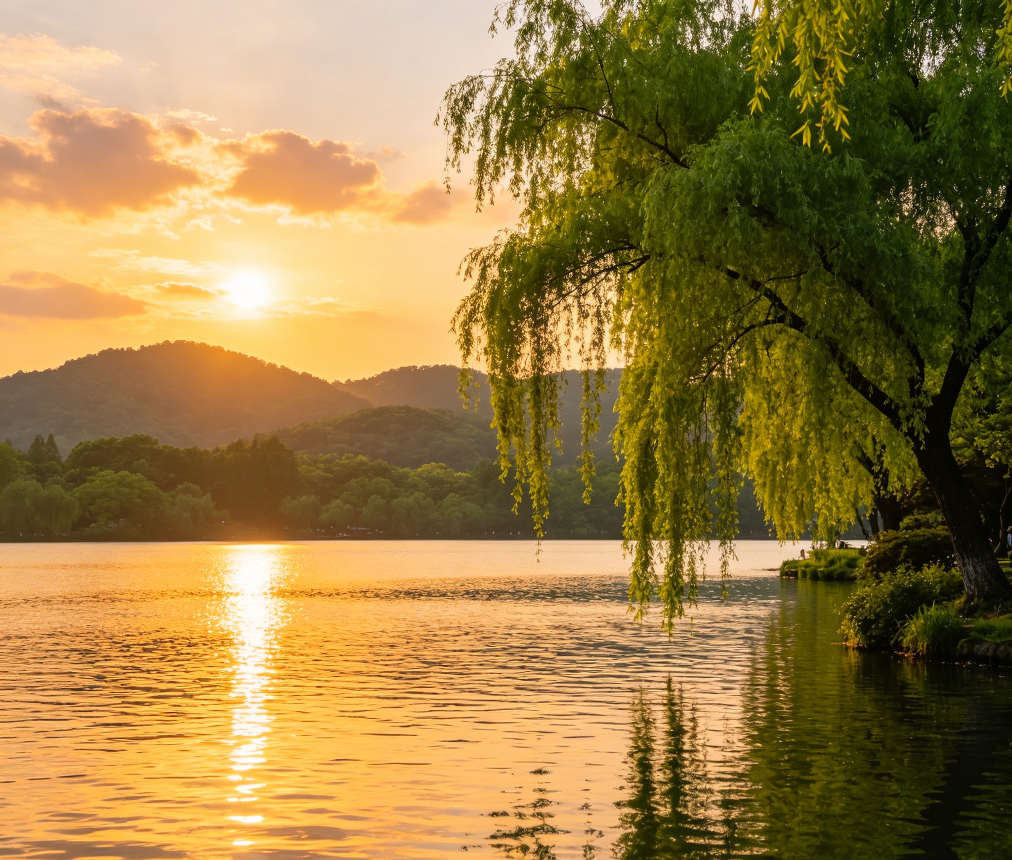 晚灯点点映清波。