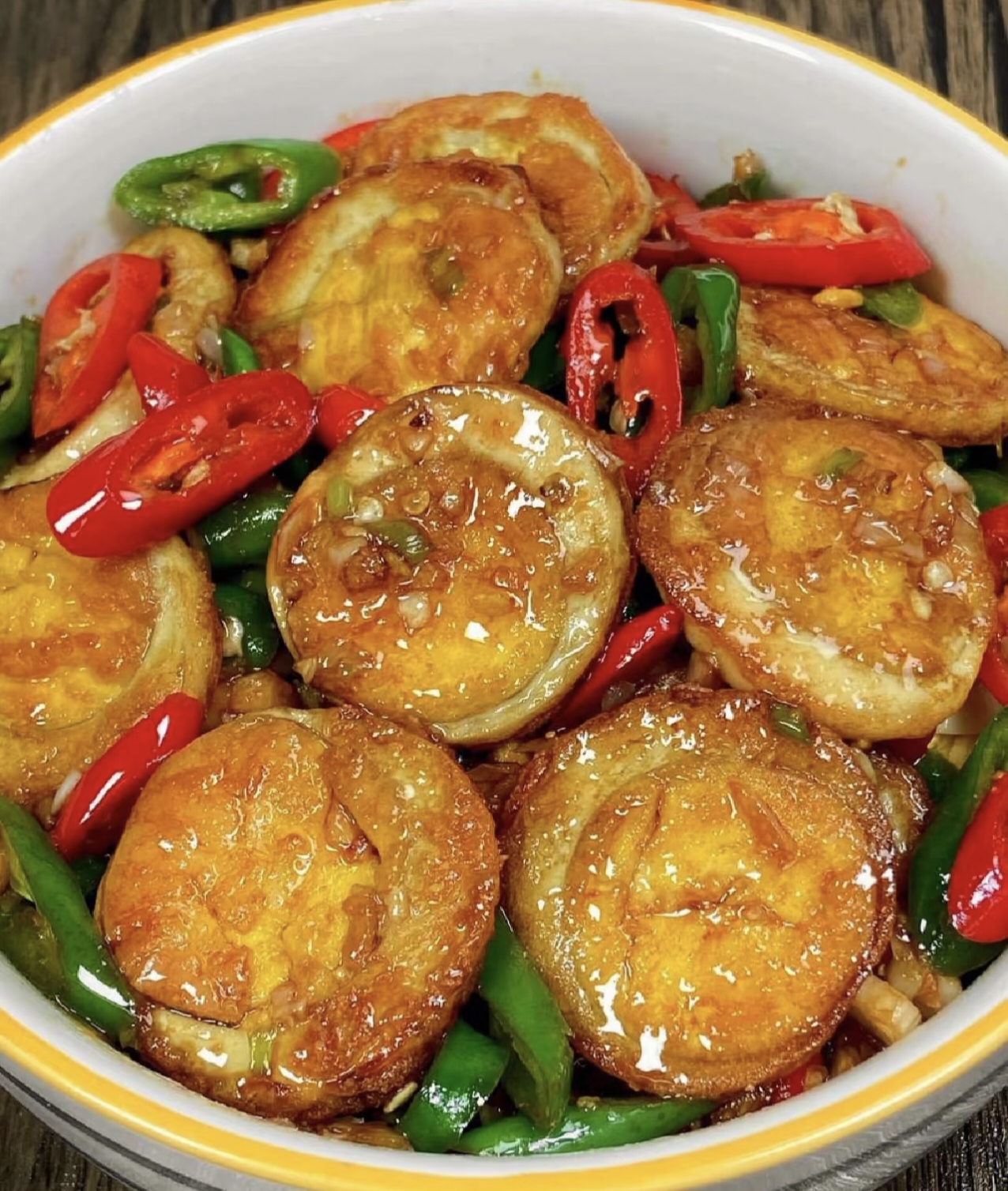 另起锅爆香蒜末小米辣,倒入调好的酱汁煮至冒泡。重点来了!把炸好的蛋片轻轻推入锅中,用颠锅代替翻炒,这样既能裹满酱汁,又不会破坏酥壳。最后加入青红椒丝,大火翻炒10秒立刻关火,脆嫩的辣椒是这道菜的灵魂点睛!
