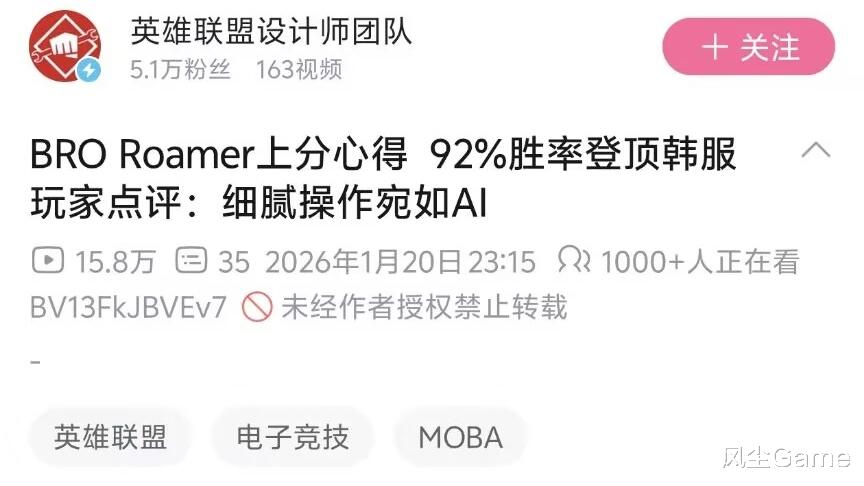 但“AI派”的玩家们,总是以这个账号里实况录屏的操作(部分操作堪称脚本),来质疑账号归属,因此保AI派,和质疑AI派的两类玩家,一度吵得不可开交,在讨论度逐渐降低之际,拳头官方设计师发布视频,公布了该账号的使用者,和韩网爆料的一样,账号确实隶属于BRI中单Roamer。