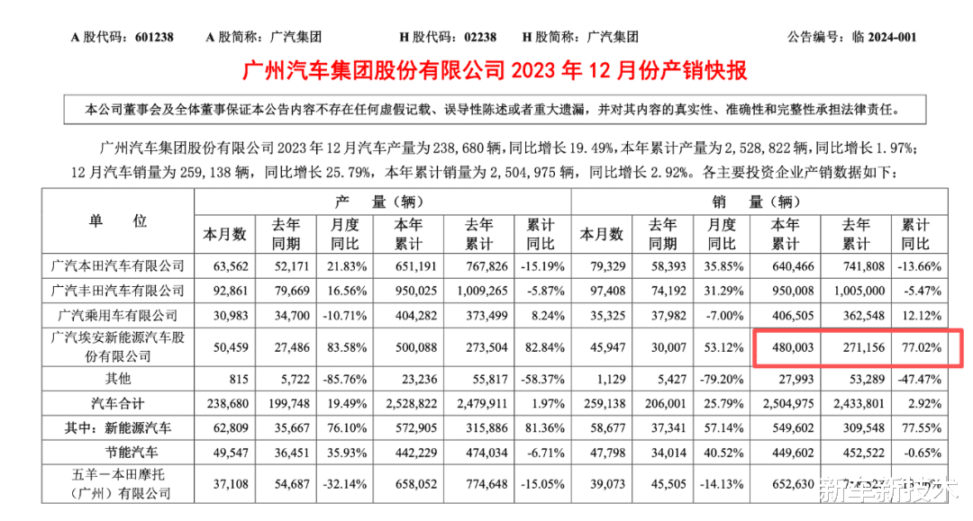 就在并不遥远的2023年,广汽埃安还是一片高歌猛进的景象。凭借高达48万辆的年销量,以及高达77%的同比增速,广汽埃安稳稳占据中国新能源销量榜的季军位置,仅次于巨头比亚迪和特斯拉。