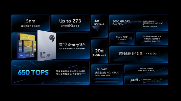 星空6P被余凯称为“地平线成立以来最重要的产品”。它采用5nm车规制程,算力达到650 TOPS,内存带宽273 GB/s,集成20个CPU核,CPU算力超过500 KDMIPS(征程6P是410 KDMIPS,提升明显),可以同时支持座舱数字AI和高阶智能辅助驾驶大模型部署。余凯在这里特意提了CPU算力的重要性——过去几年大家有个错觉,觉得端到端时代CPU不重要了,但Agent计算时代到来后,强CPU又变得至关重要。星空恰好赶上了这个节点。