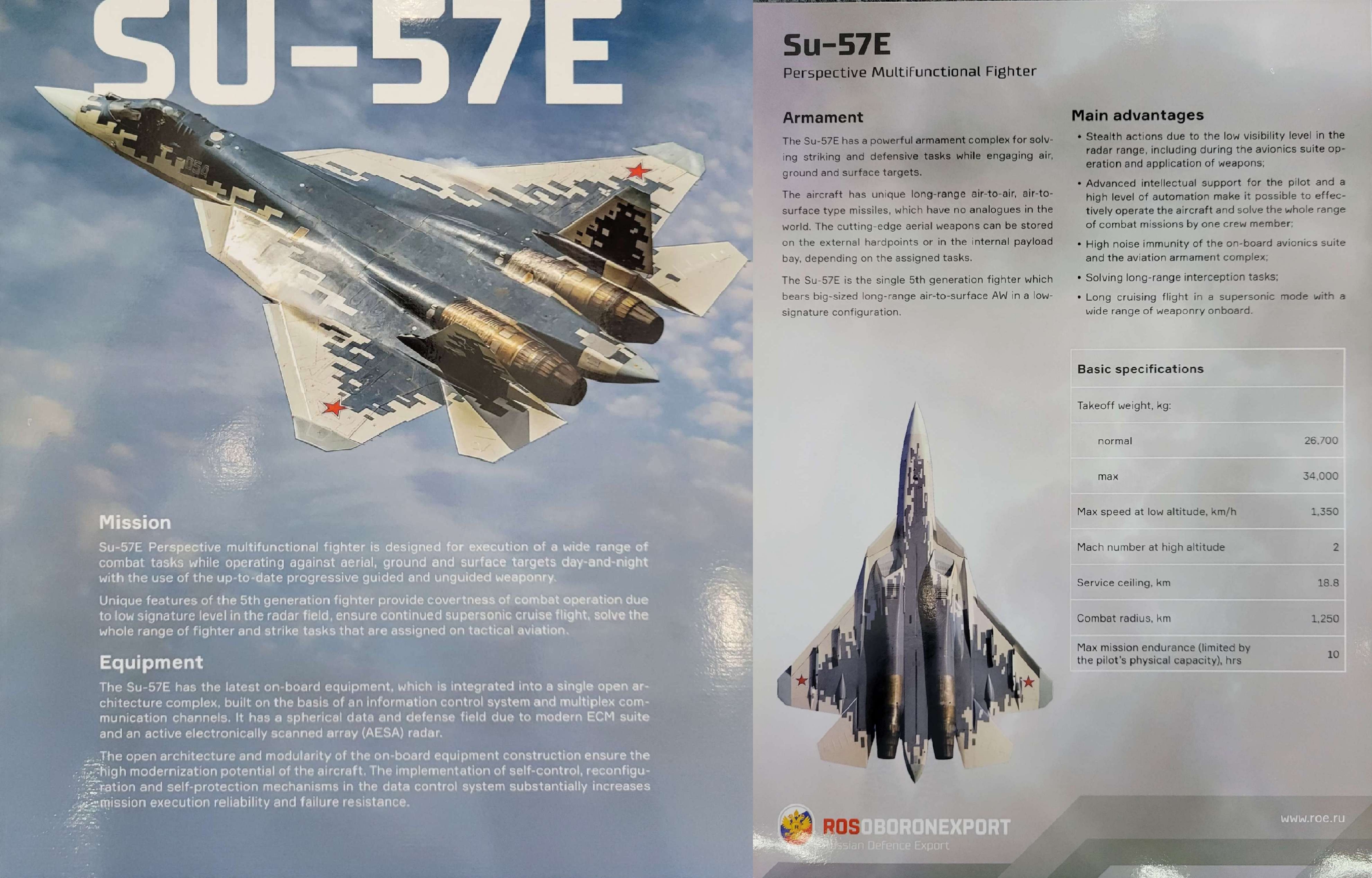 当时ROSTEX公司还给出了苏-57E出口型的技术宣传册,显示苏-57E的最大起飞重量为34吨,最大飞行速度2马赫,作战半径1250千米。