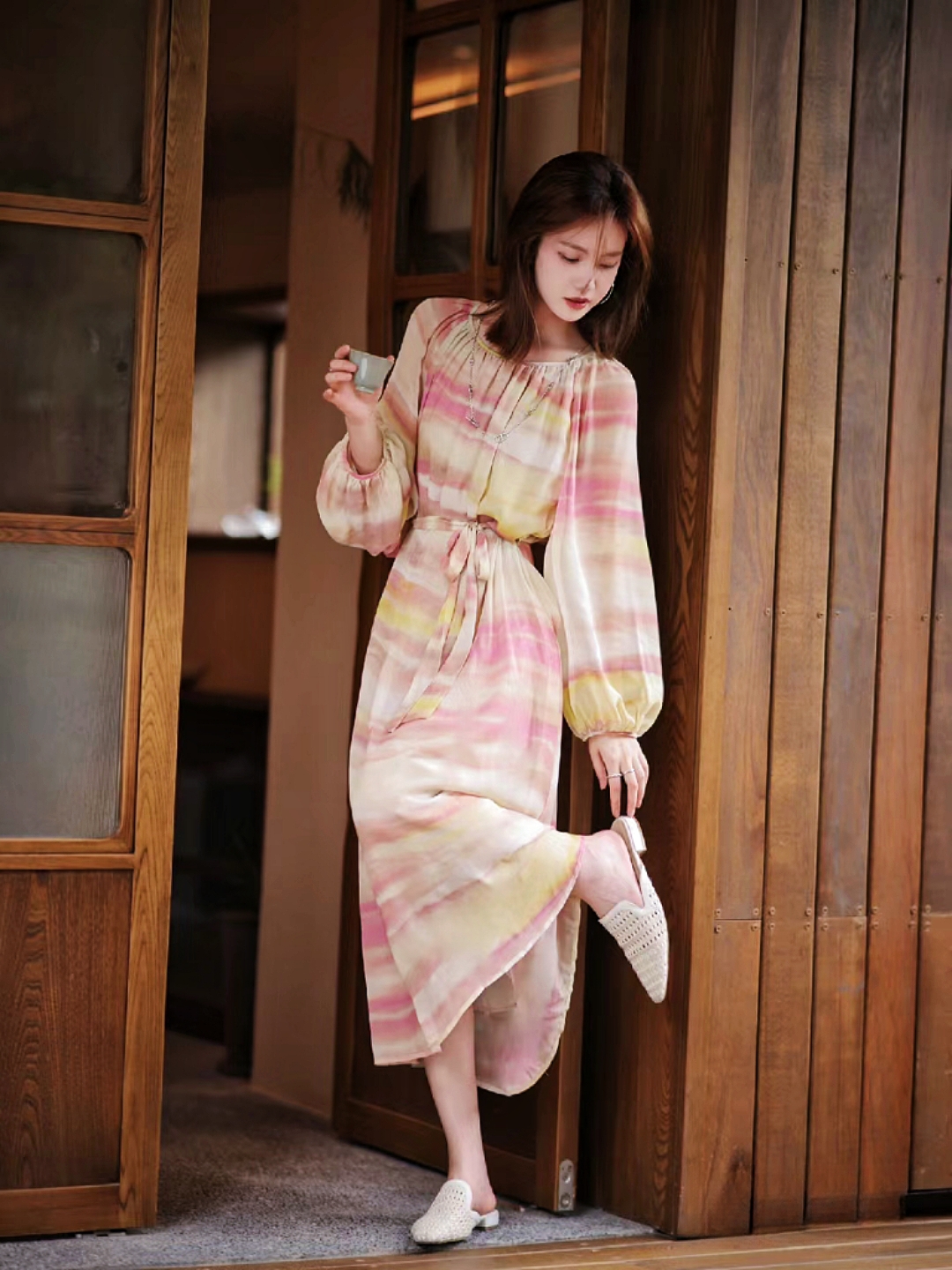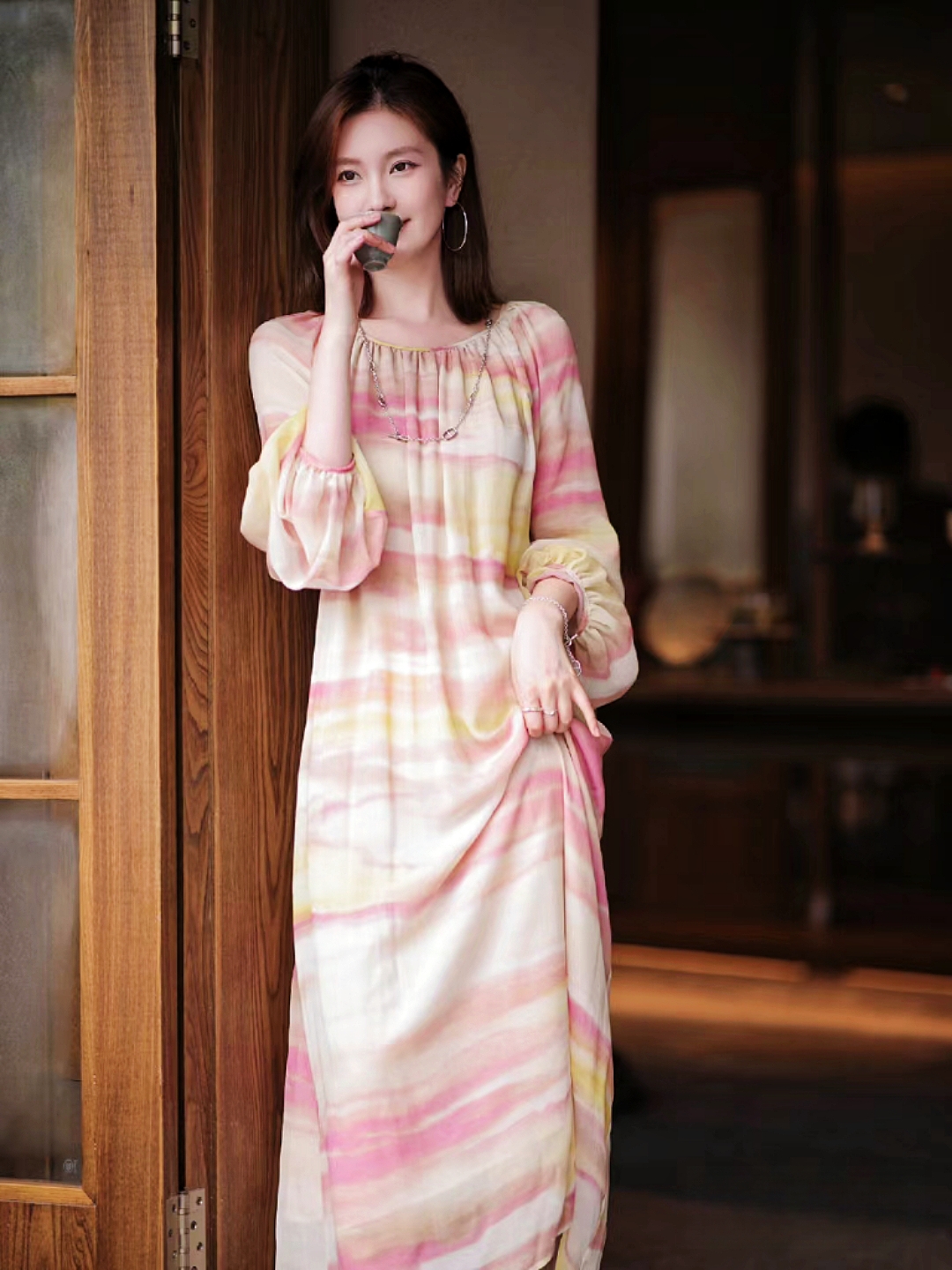 为了增加造型感和适应不同场合的需求,在腰间配备了一根本布腰带。通过随意调节腰带松紧度, 可以打造出不同风格和形状感, 从而满足各种场合所需。这款系带收腰茶歇裙选用真丝面料制作而成,柔软光滑且具有良好的透气性。穿上它时会感受到丝绸般的触感和轻盈飘逸感受。无论是参加派对、约会还是日常休闲活动, 这件连衣裙都能让你散发出自信。