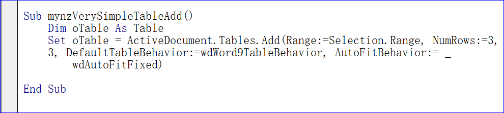 Set oTable = ActiveDocument.Tables.Add(Range:=Selection.Range, NumRows:=3, NumColumns:= _